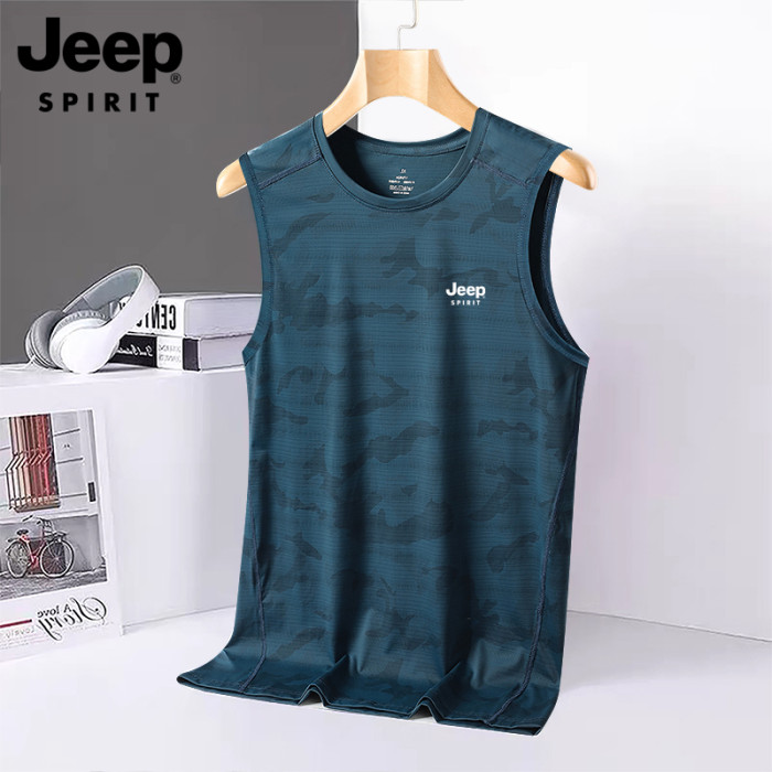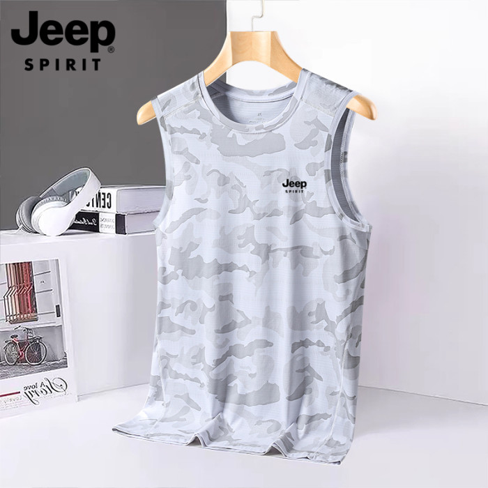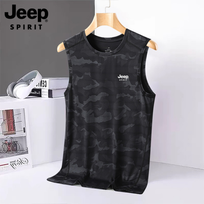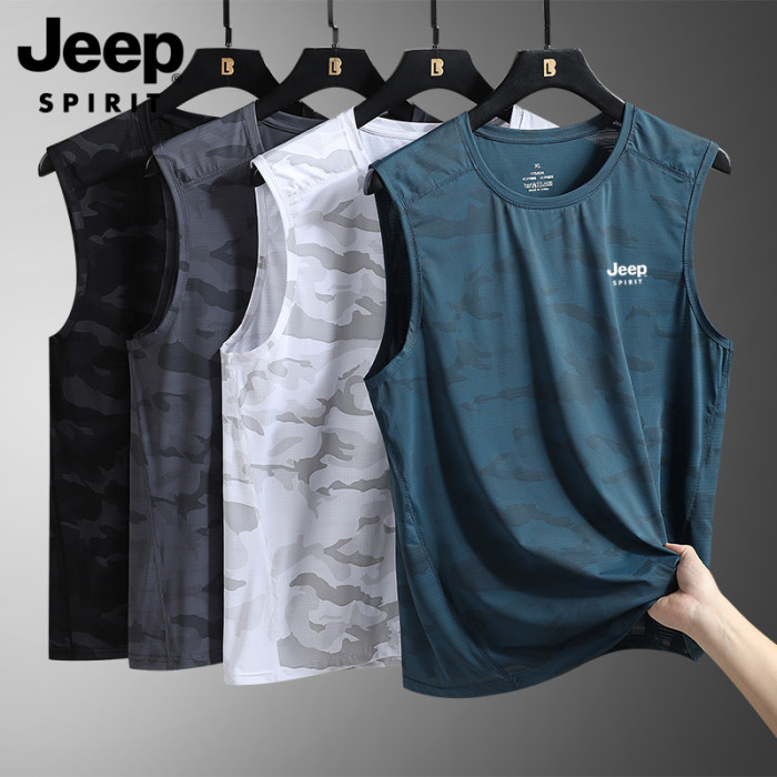 JEEP吉普速乾背心男士夏季休閒冰絲汗衫圓領運動健身無袖坎肩T恤