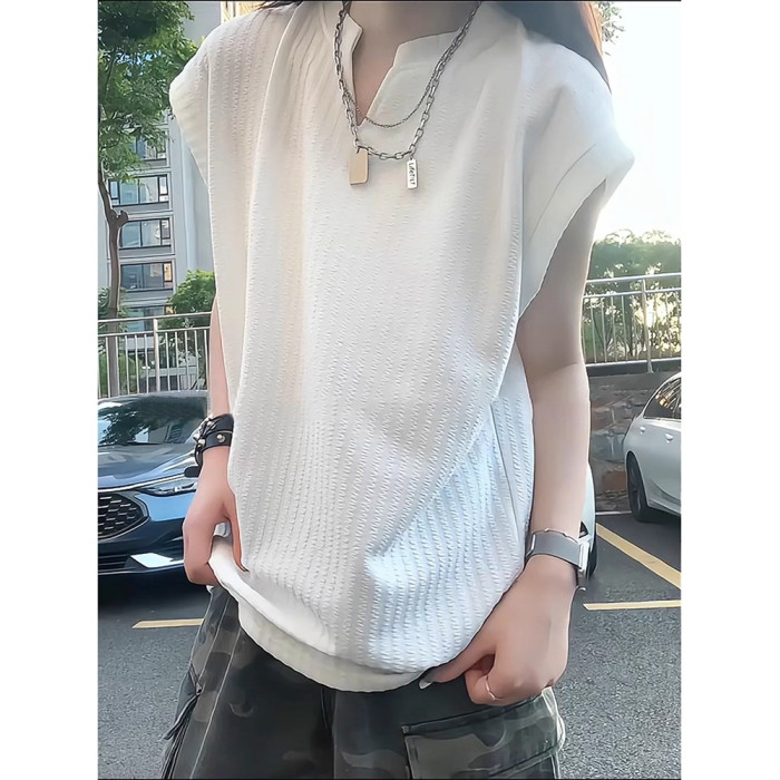 白色肌理感冰絲v領背心男女夏季薄款速乾運動汗衫無袖t恤美式坎肩