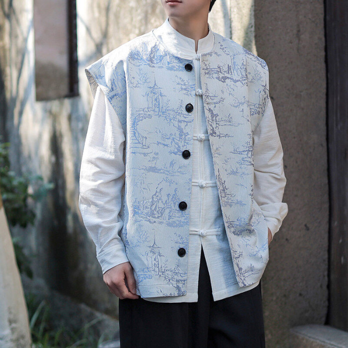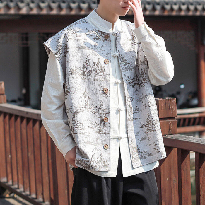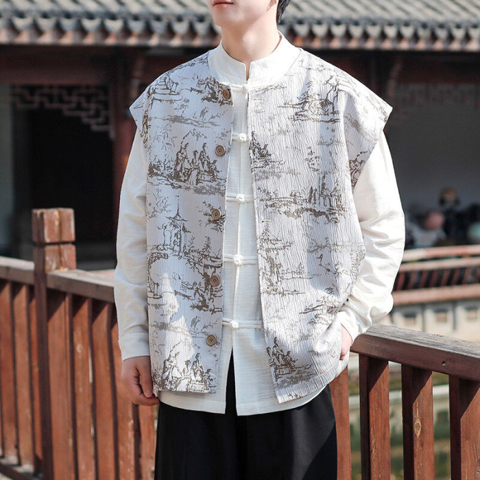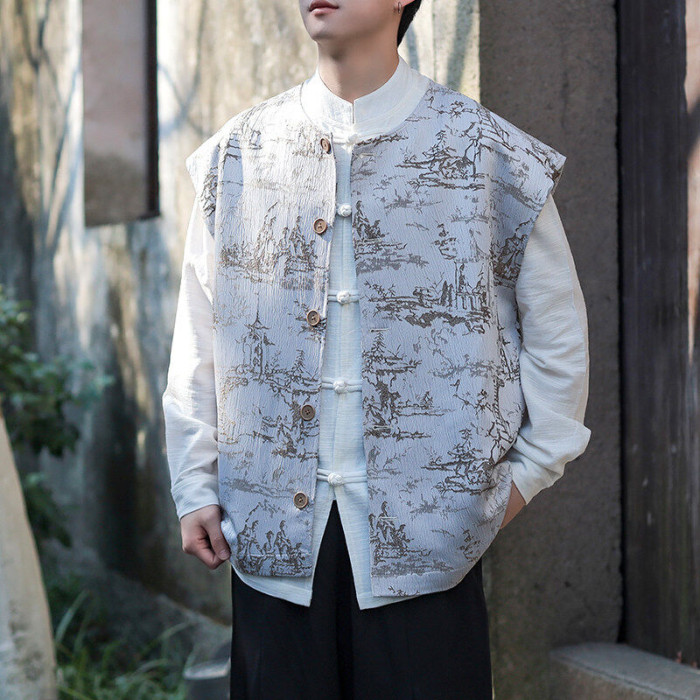 開源 風春夏無袖馬甲男 新中式穿搭 提花盤釦唐裝坎肩 國潮