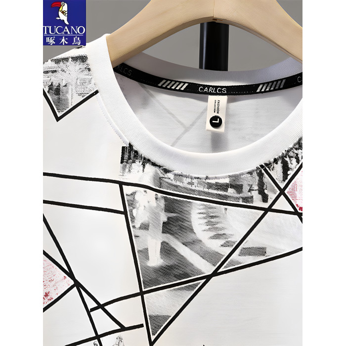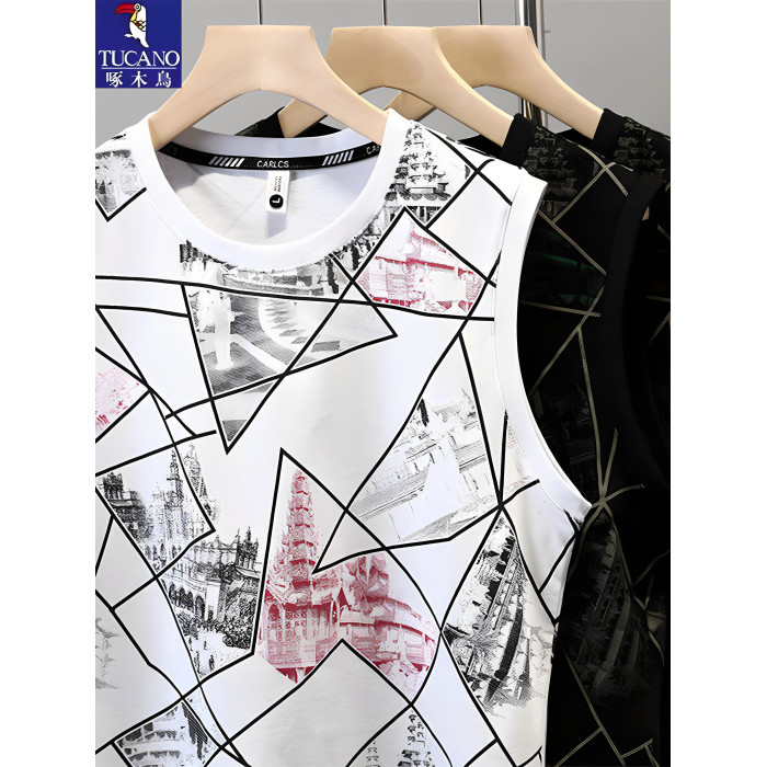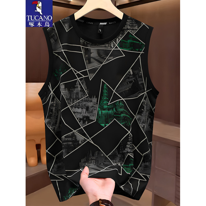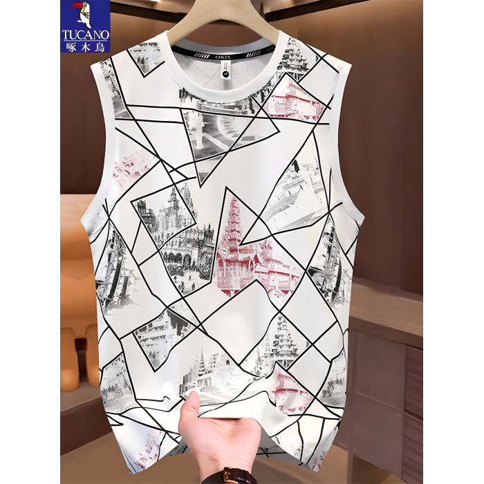 啄木鳥男夏背心無袖圓領坎肩印花運動上衣寬松大碼休閒上衣大碼