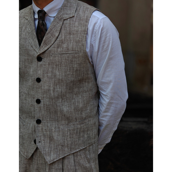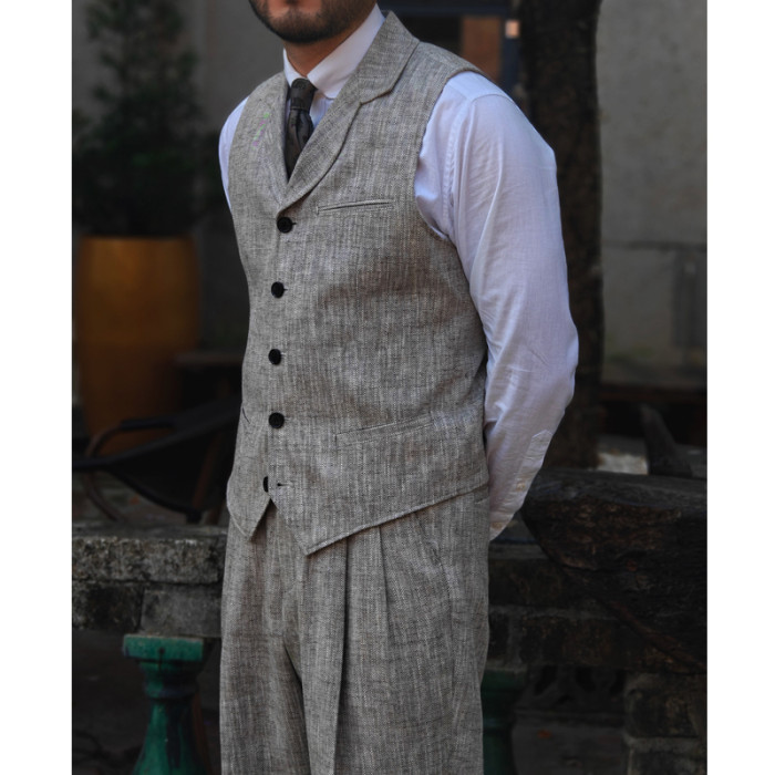 Plan B 春秋意式棉麻休閒馬甲vintage復古人字紋西裝馬甲外套男