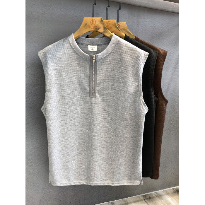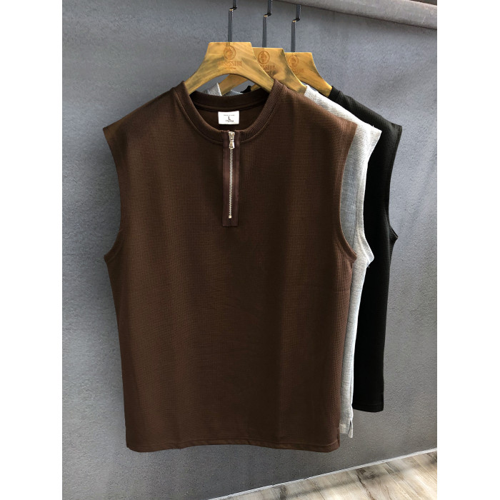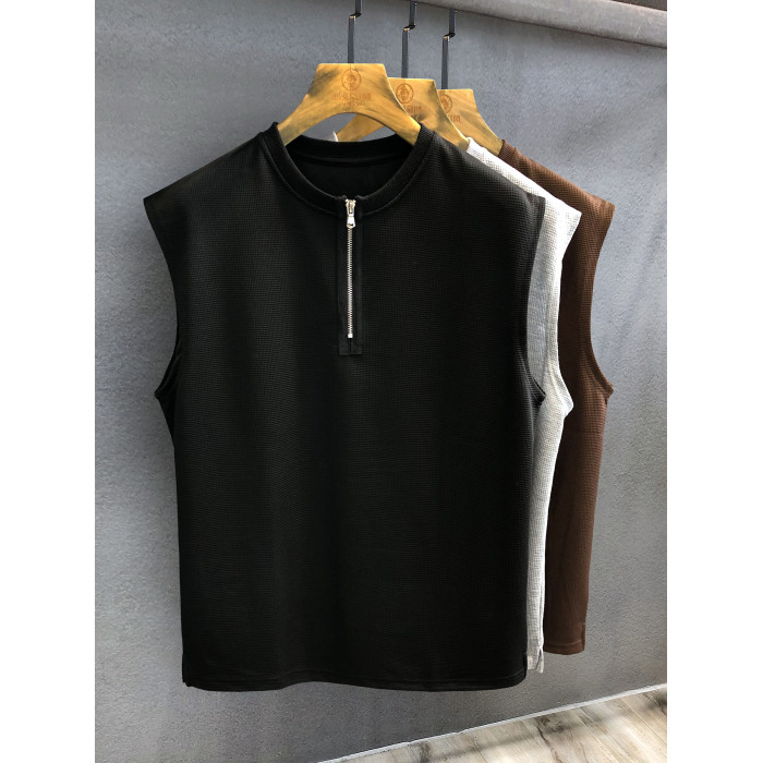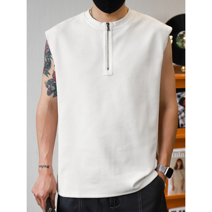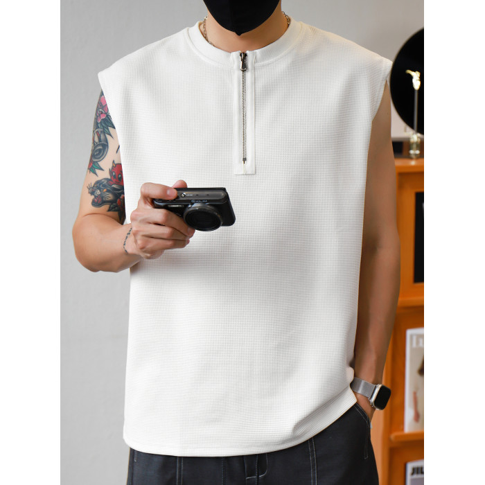 極簡華夫格肌理透氣半拉鍊無袖T恤男士運動背心2025寬松坎肩體恤