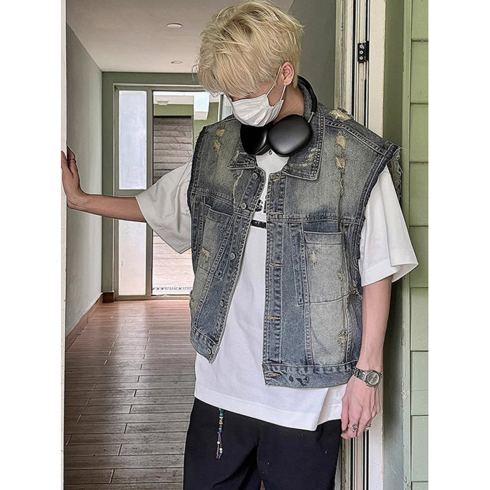 美式復古水洗磨毛邊短款牛仔馬甲男夏季潮牌ins水洗做舊坎肩外套