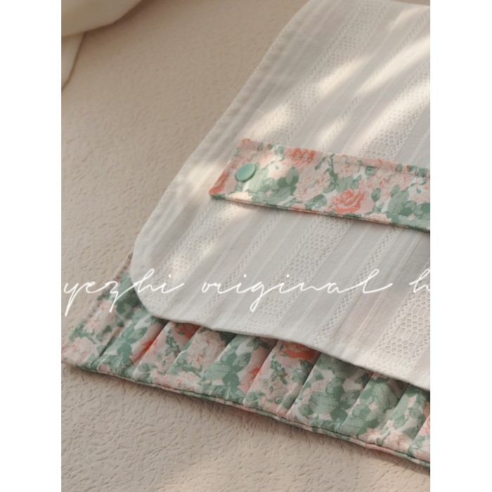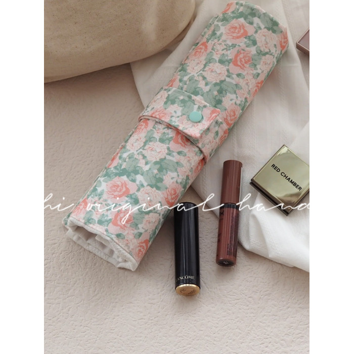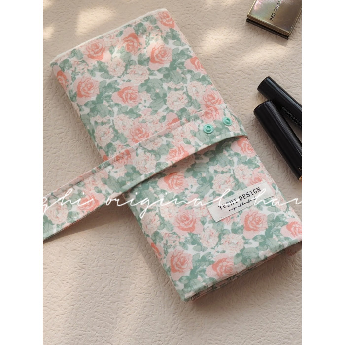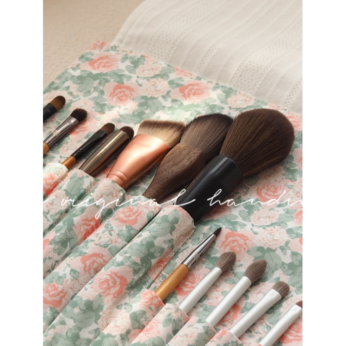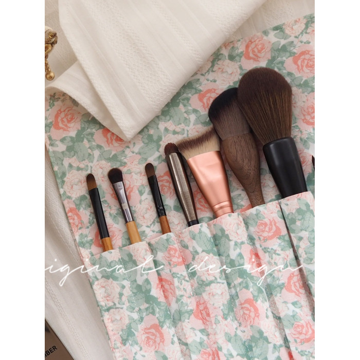 野梔原創淡綠色系復古玫瑰小碎花化妝刷收納包刷包卷簾式筆袋