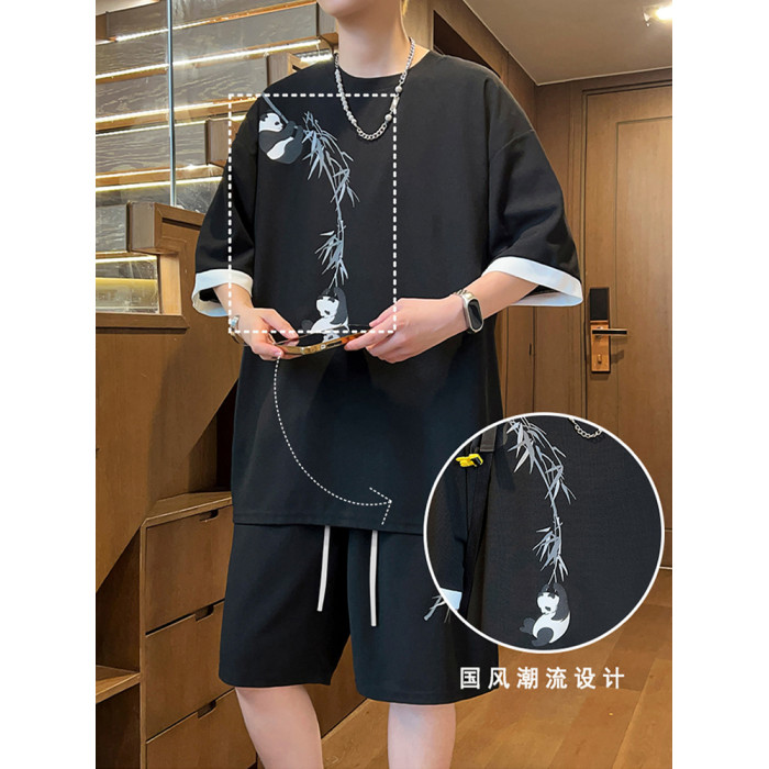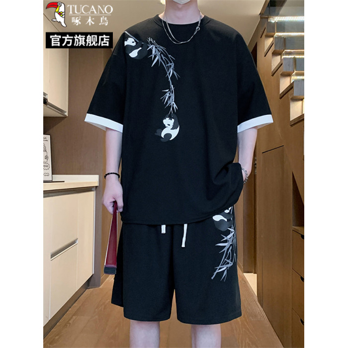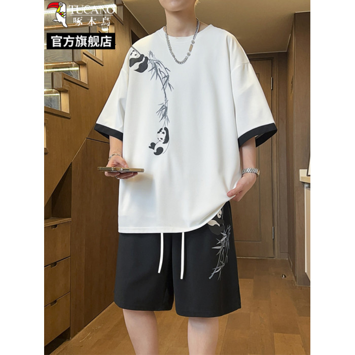 啄木鳥夏季休閒套裝男士2025新款假兩件國潮運動短袖短褲兩件裝L