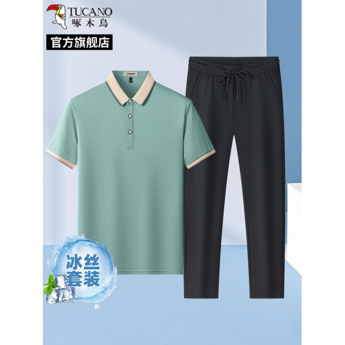 啄木鳥2025夏季短袖POLO衫+冰絲直筒運動休閒長褲子男士T恤套裝H