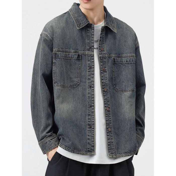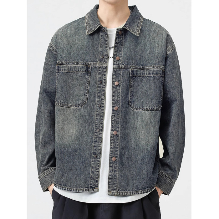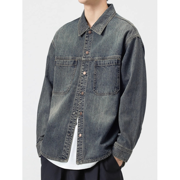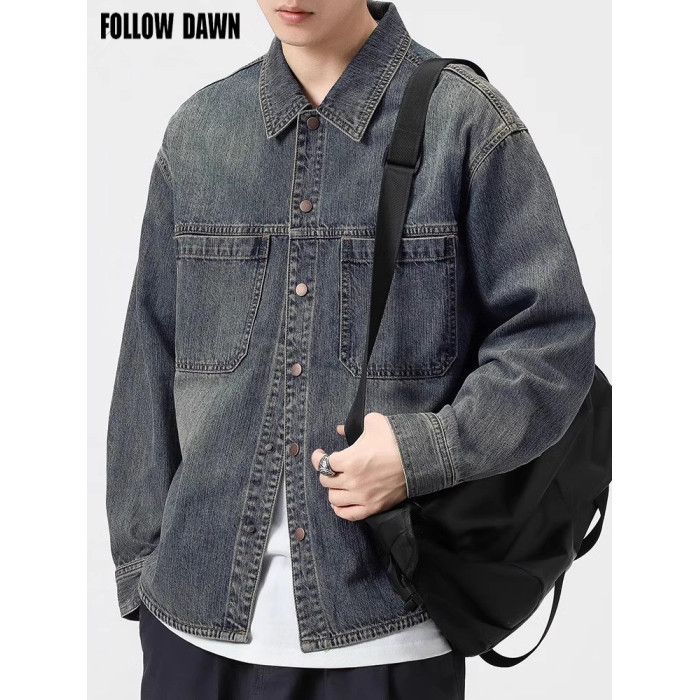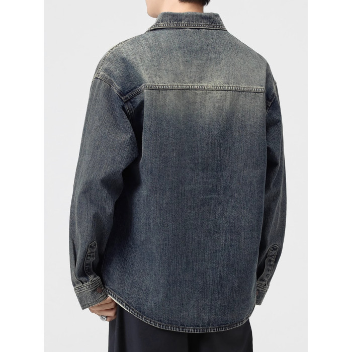 美式復古藍牛仔襯衫男士長袖春季新款潮牌休閒寬松襯衣外套