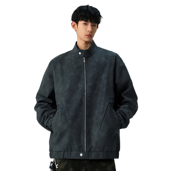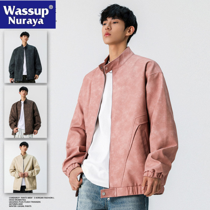 WASSUP NURAYA2025春秋美式復古皮衣休閒夾克寬松立領機車外套男