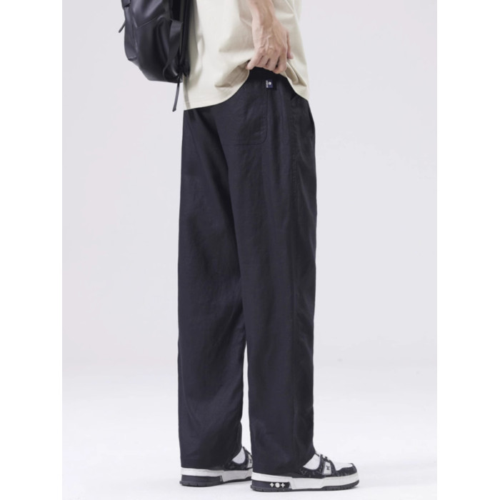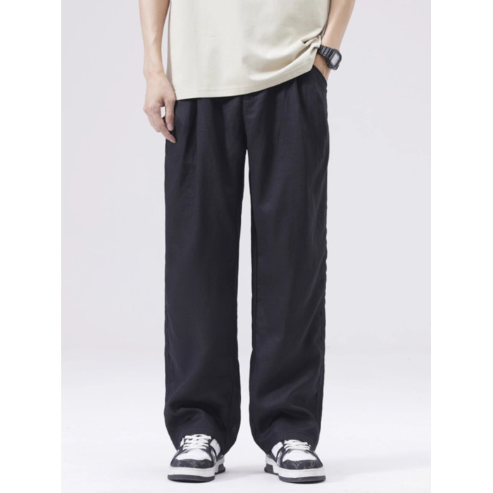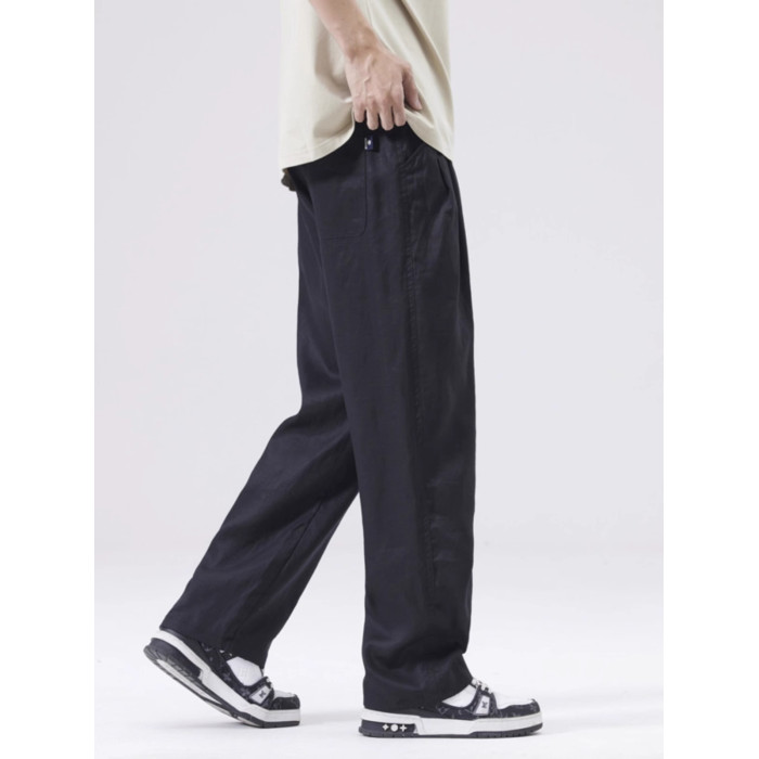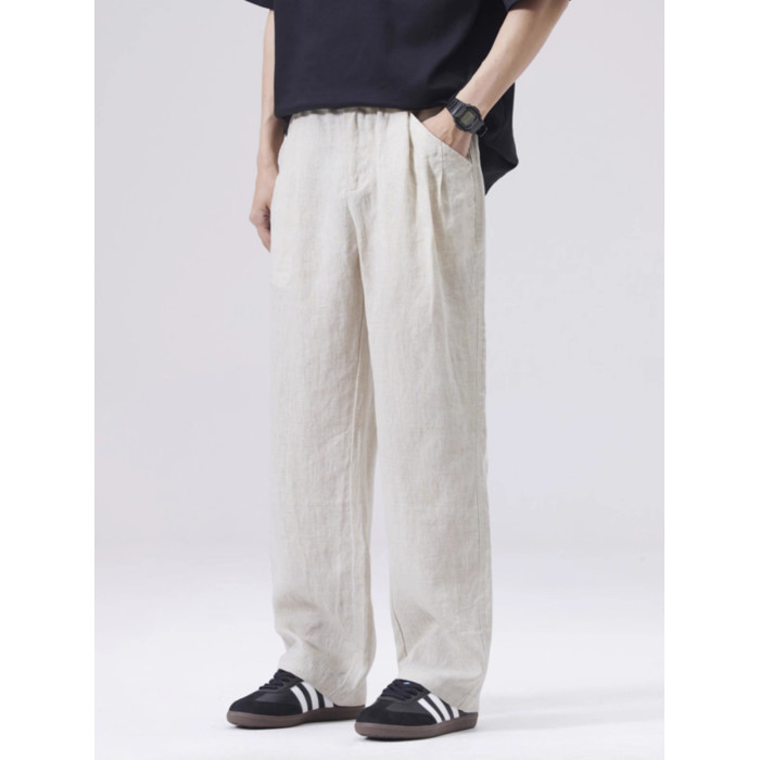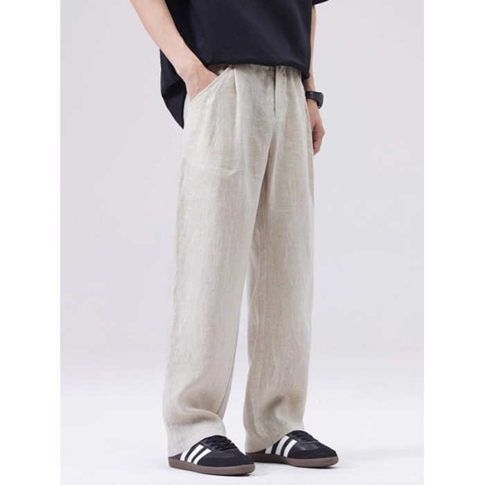 高級杏色棉麻褲子男2025夏季薄款透氣濶腿寬松直筒百搭休閒西褲