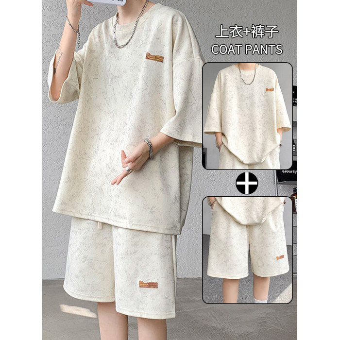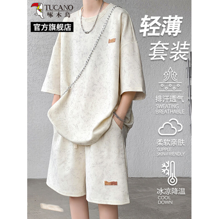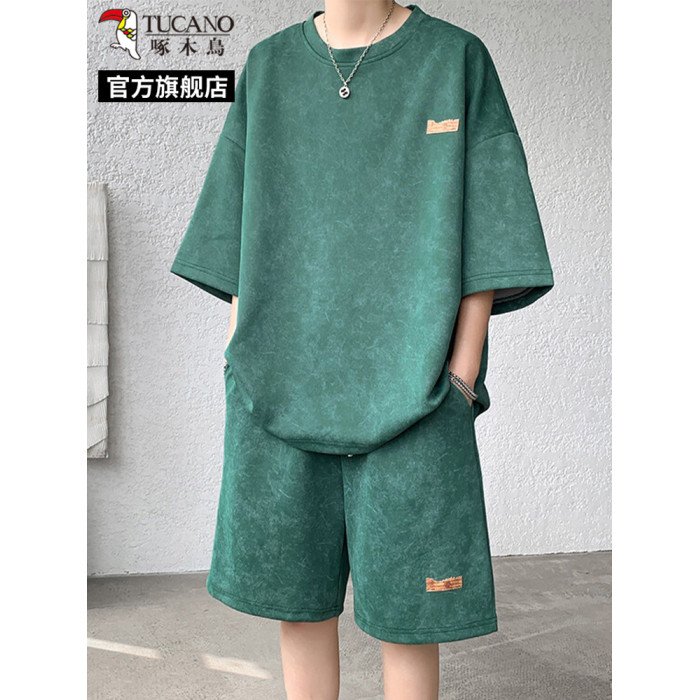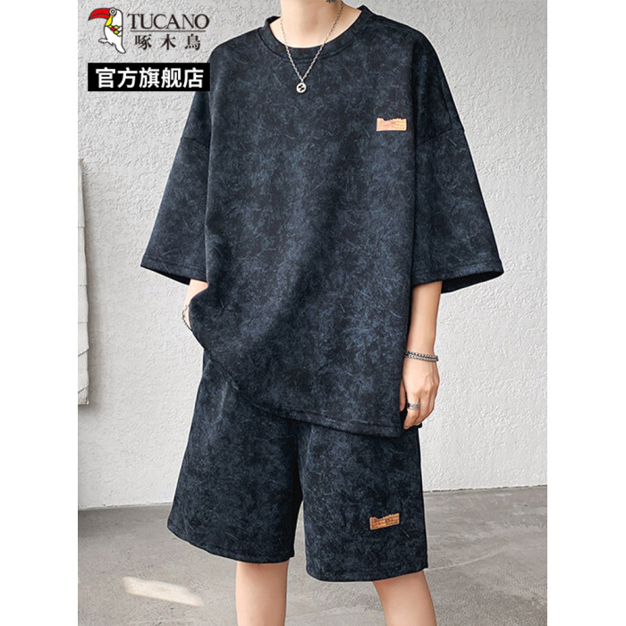 啄木鳥男士休閒運動套裝男款夏季短袖短褲兩件套潮牌一整套衣服L
