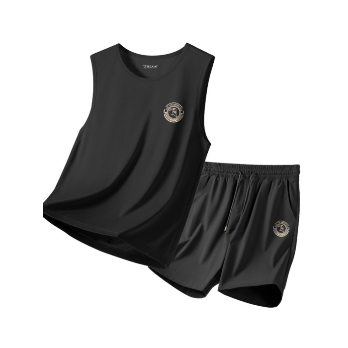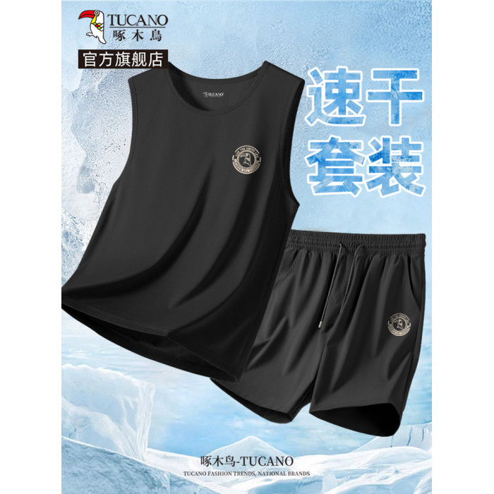 啄木鳥黑色高級感背心男休閒套裝夏季冰絲短褲男士無袖T恤2件套YB