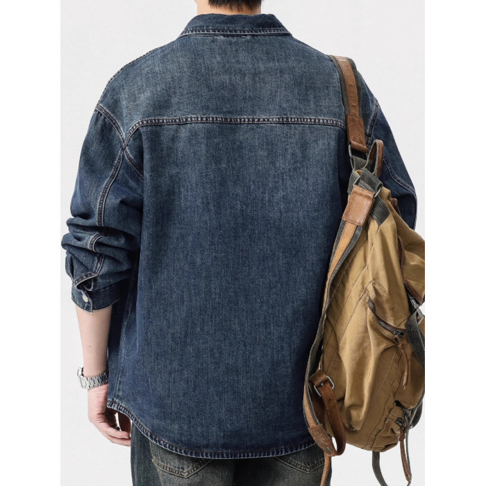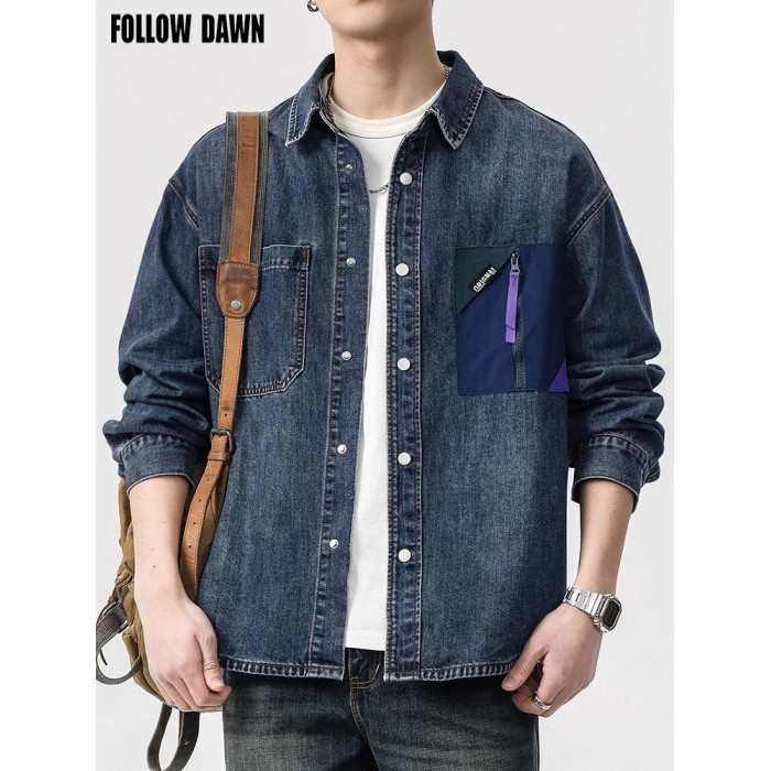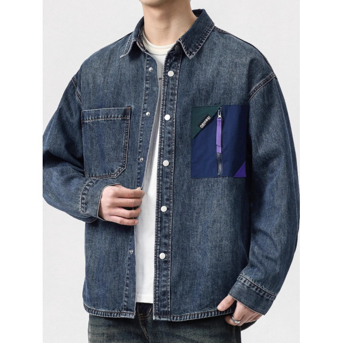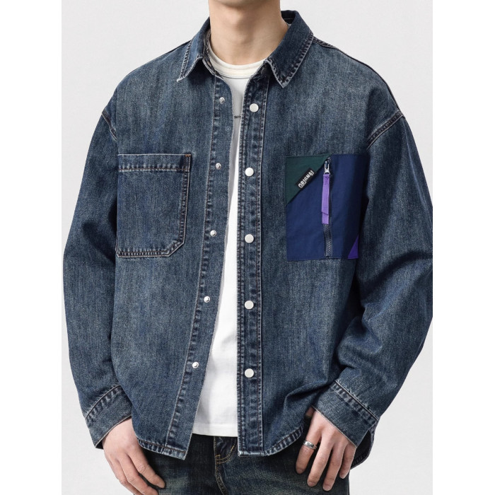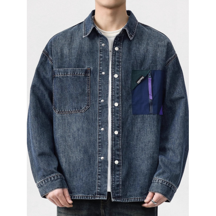 高級2025春季撞色口袋翻領牛仔襯衫男長袖潮牌休閒初秋外套襯衣