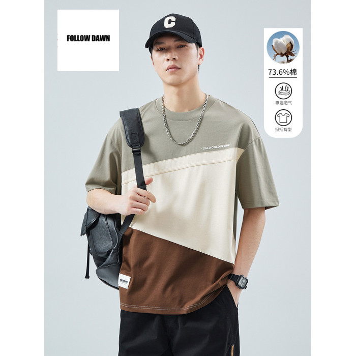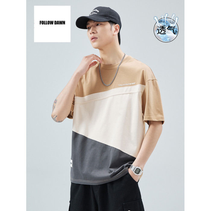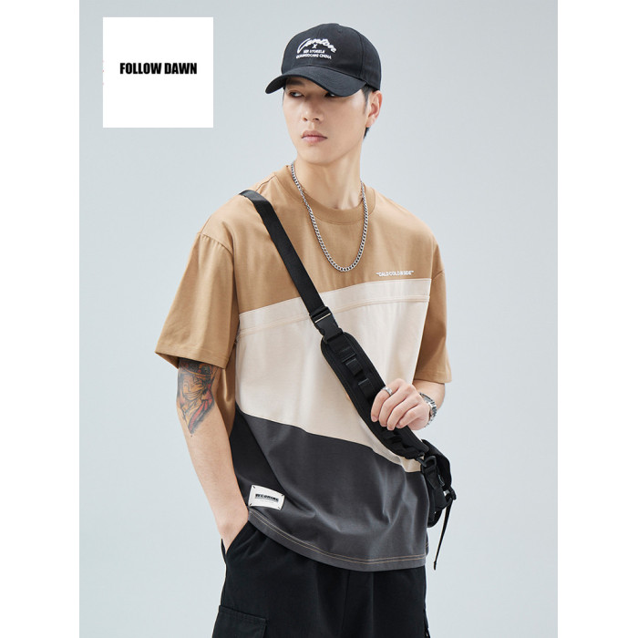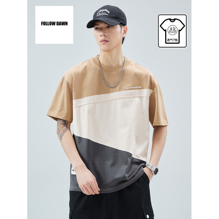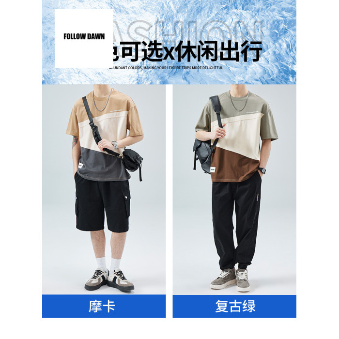 潮牌短袖t恤男夏季新款圓領寬松設計感拼接男生半袖上衣