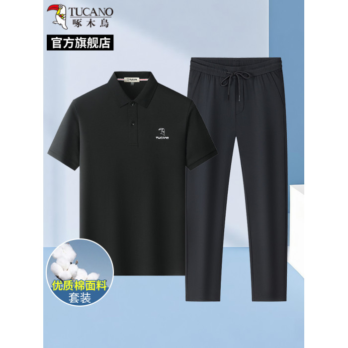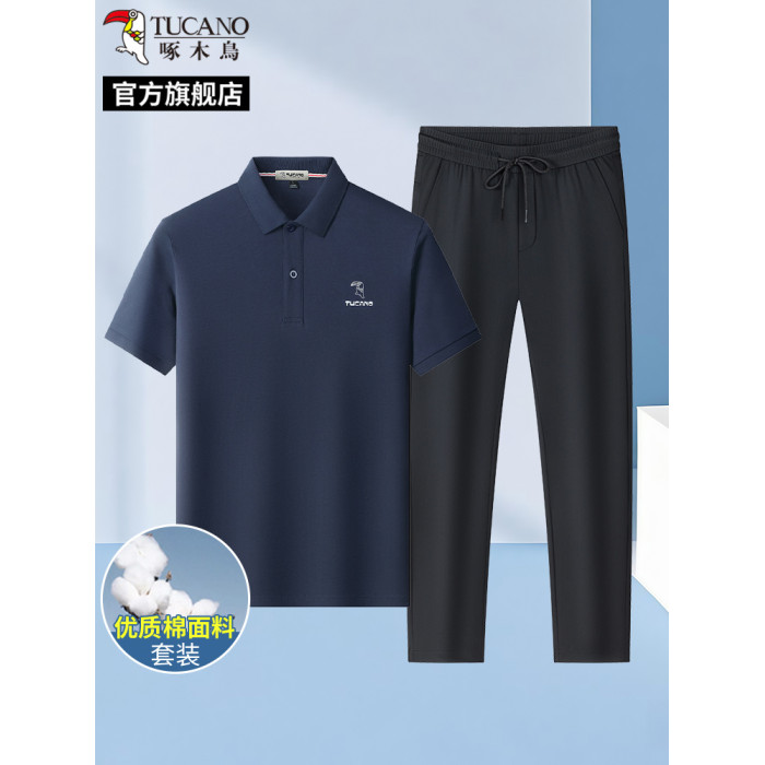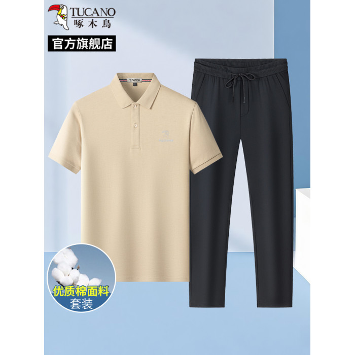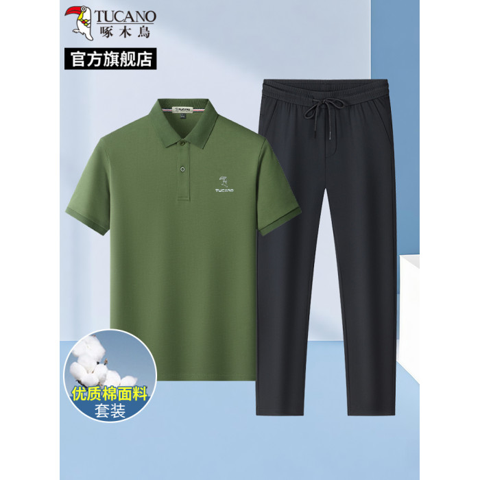 啄木鳥夏季純棉短袖POLO衫+冰絲直筒休閒褲子爸爸裝男士T恤套裝H