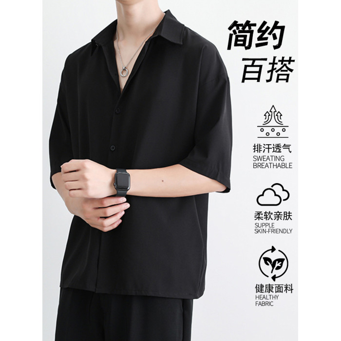 啄木鳥冰絲短袖襯衫男士夏季2025新款寬松日系免燙休閒五分襯衣L