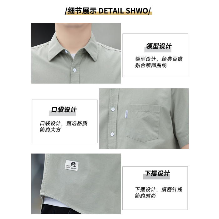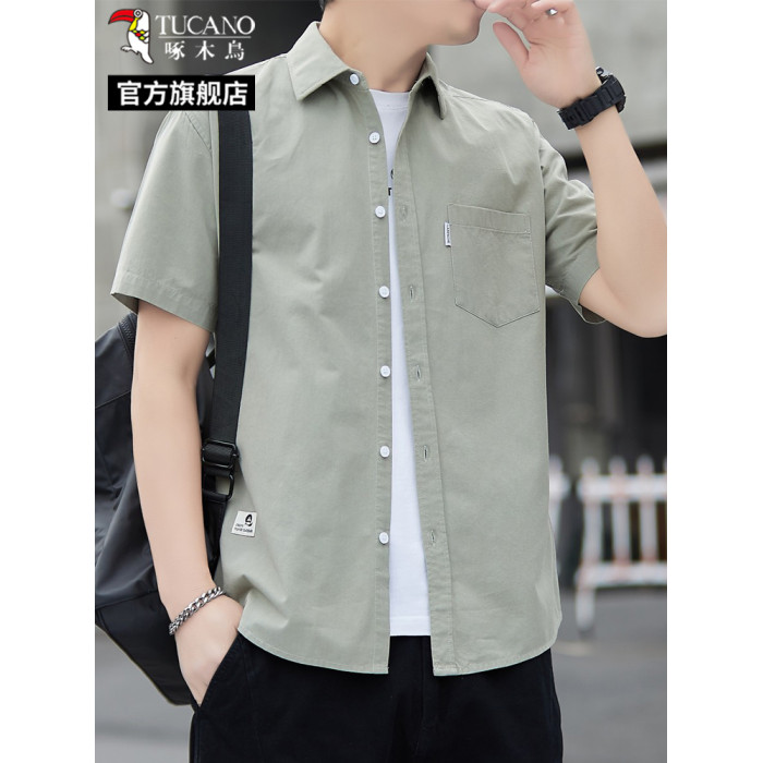 【100%純棉】啄木鳥男士短袖襯衫夏裝大碼寬松休閒口袋款襯衣男C