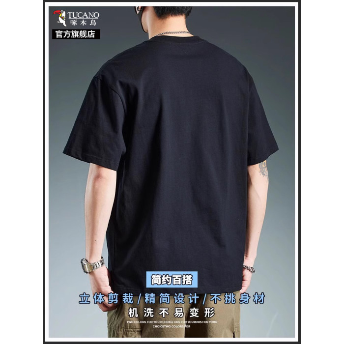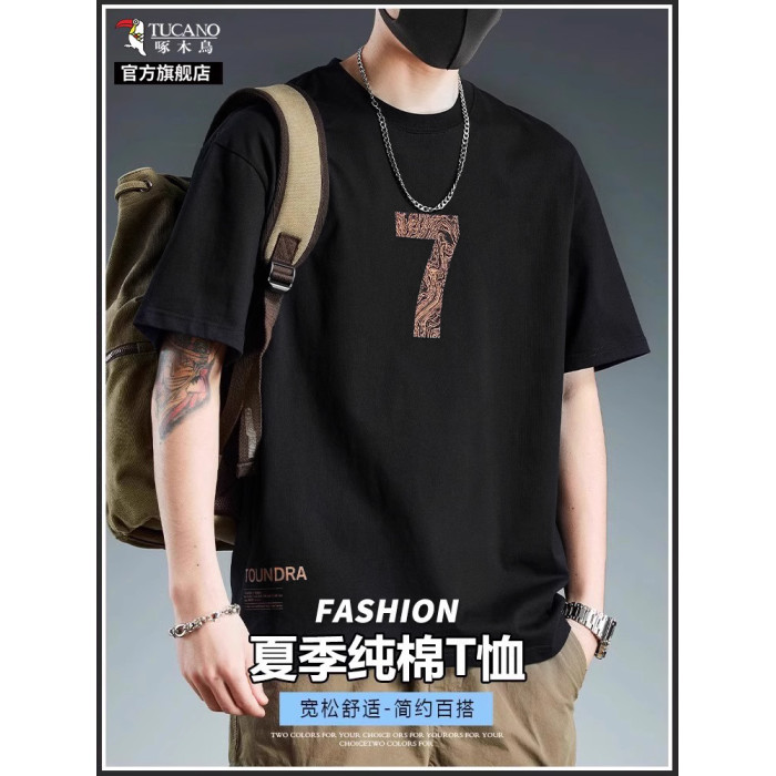 啄木鳥純棉印花短袖t恤男士夏季薄款2025新款寬松圓領半袖衫體恤K