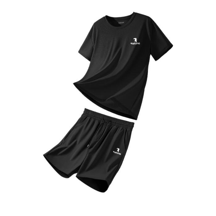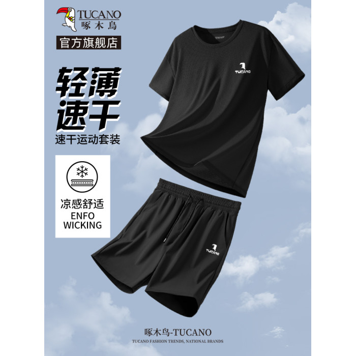 啄木鳥冰絲運動套裝男夏季薄款透氣速乾服男士跑步健身短袖短褲YB