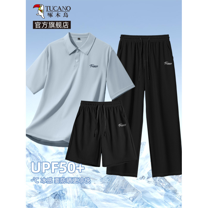 啄木鳥官方爸爸夏季套裝2025新款中年男裝冰絲短袖polo衫三件套Y