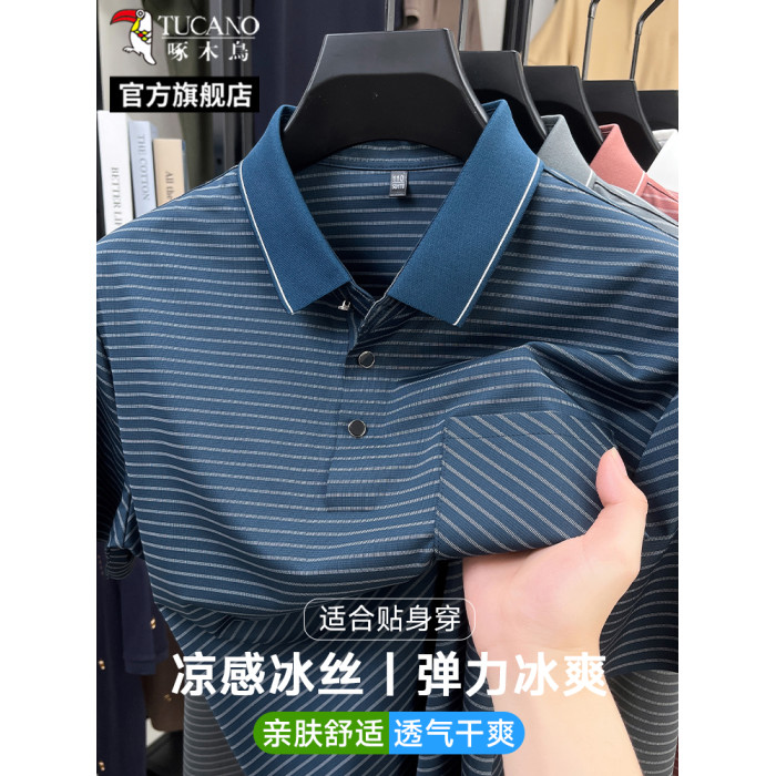 啄木鳥冰絲短袖t恤男士夏季薄款條紋翻領口袋款爸爸裝polo衫上衣C