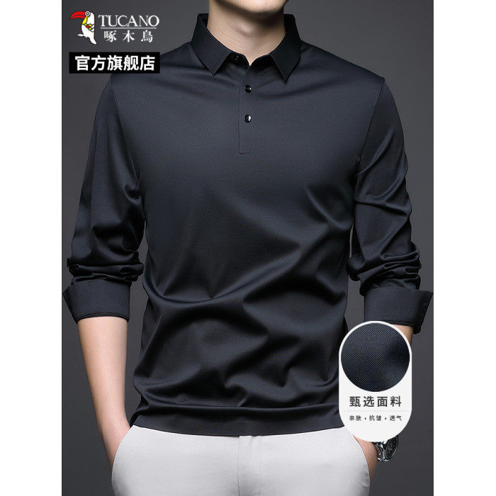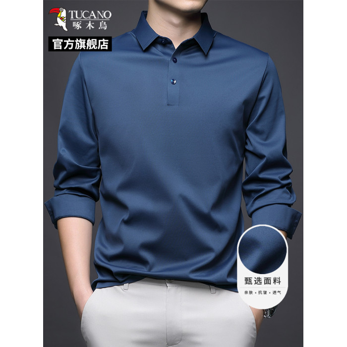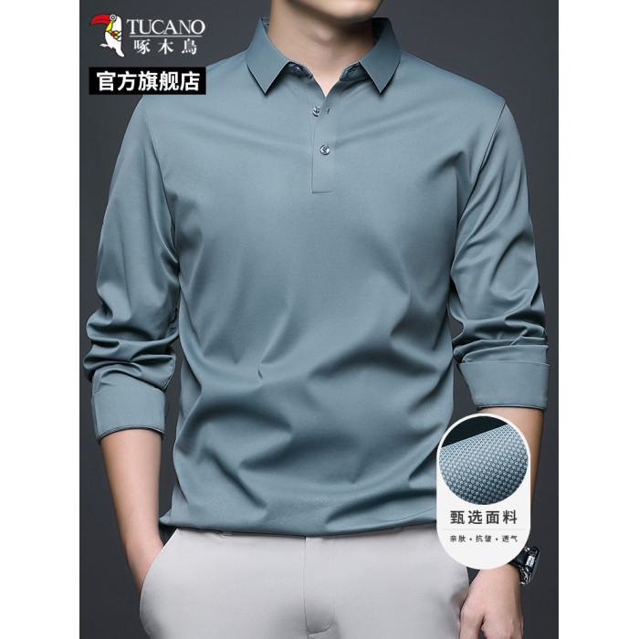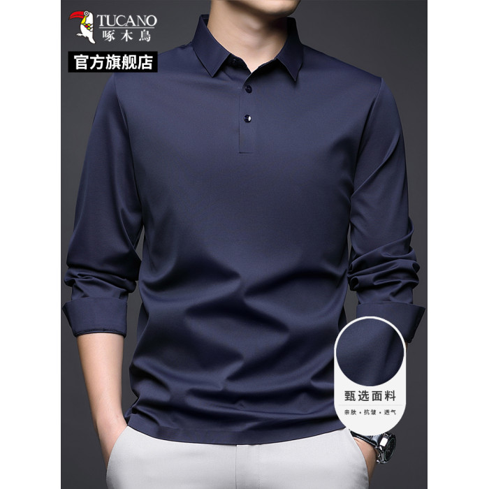 啄木鳥春秋男士翻領長袖T恤冰絲POLO衫絲光棉打底衫商務男裝上衣C
