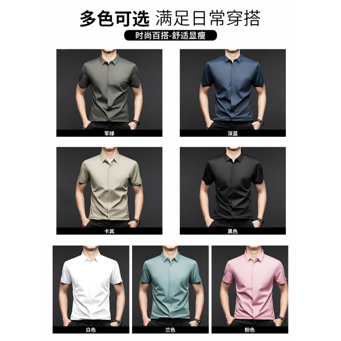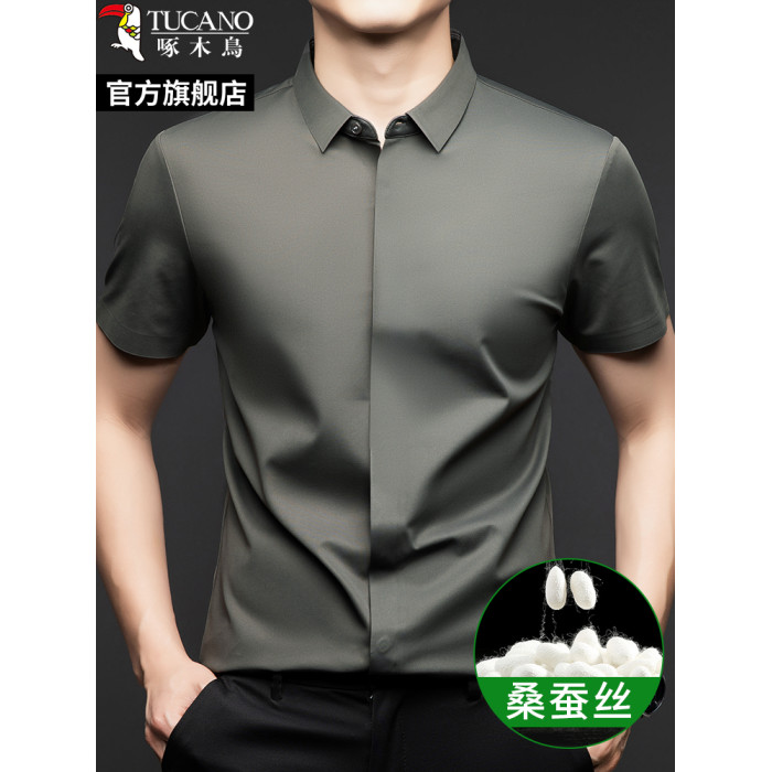 啄木鳥桑蠶絲男士短袖襯衫2025夏季新款休閒商務工裝免燙抗皺襯衣