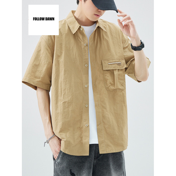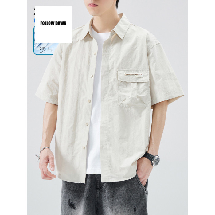 冰絲短袖襯衫男夏季新款潮流牌痞帥小衆設計高級感襯衣男