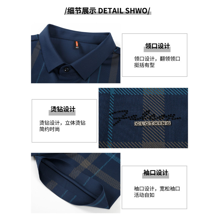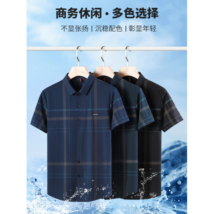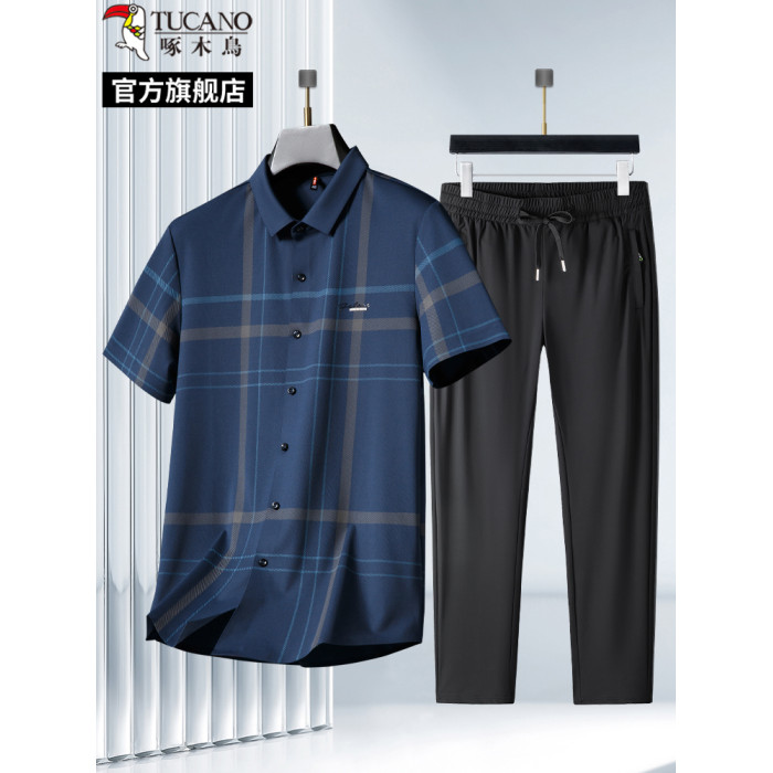 啄木鳥官方爸爸夏裝套裝男士冰絲短袖襯衫中老年父親節夏季襯衣C