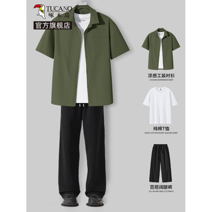啄木鳥男士套裝休閒短袖襯衫夏季2025新款男生帥氣穿搭一整套潮Y