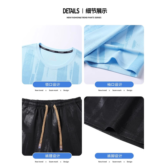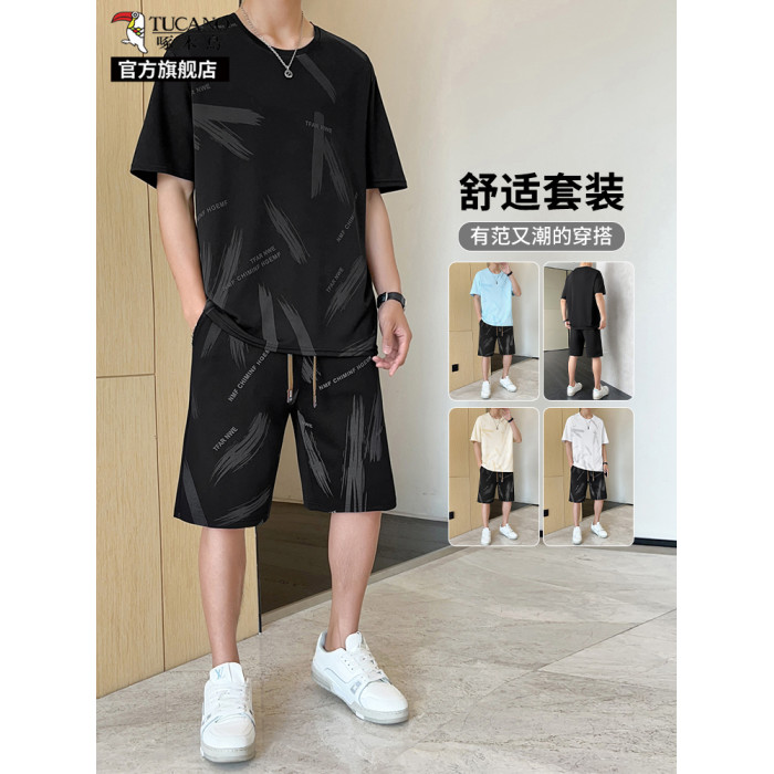 啄木鳥冰絲休閒套裝男士夏季薄款寬松運動速乾短袖t恤短褲兩件套K