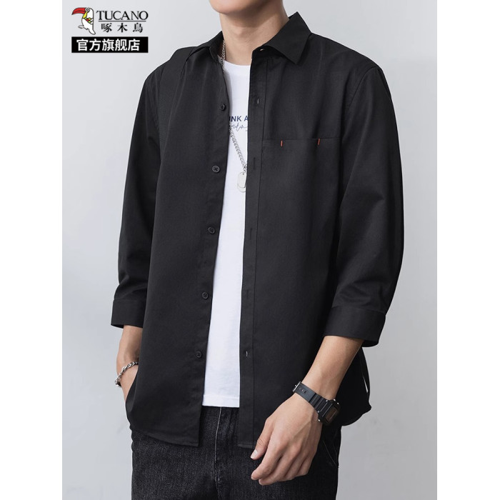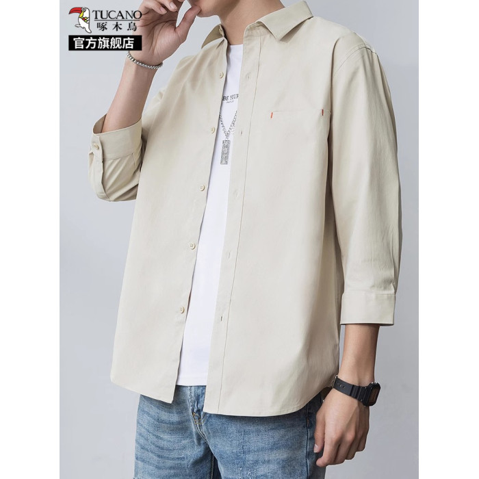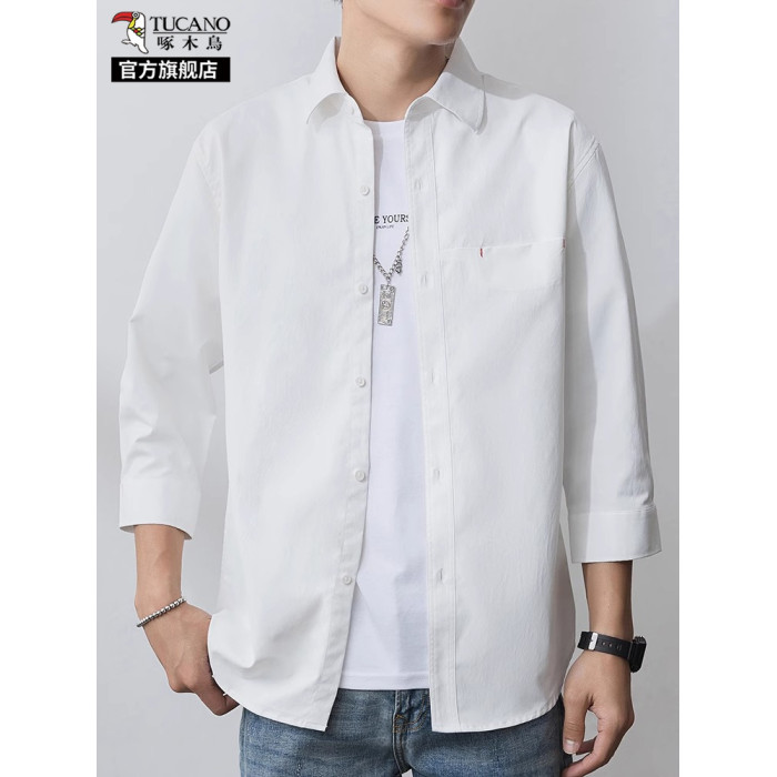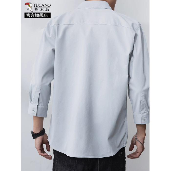 啄木鳥冰絲七分袖襯衫男士夏季薄款寬松休閒運動速乾翻領襯衣服K