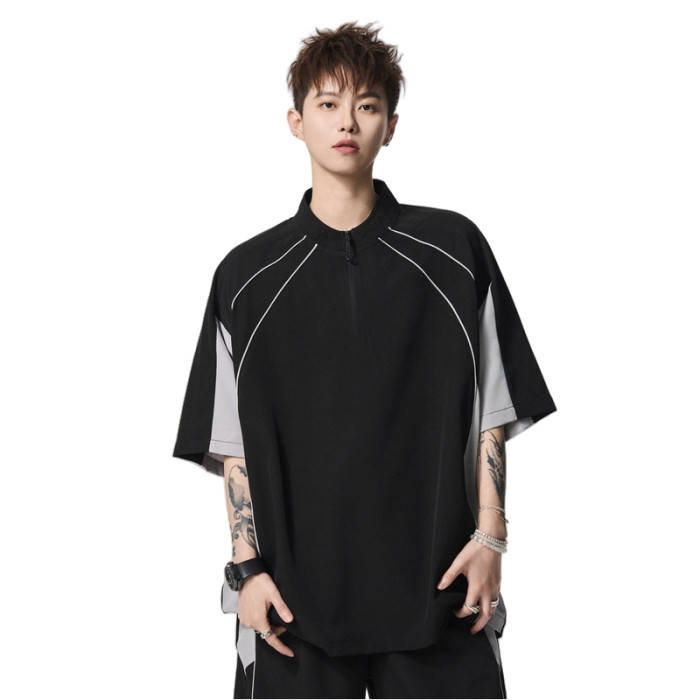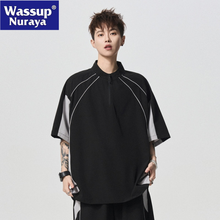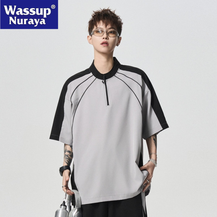 WASSUP NURAYA半拉鍊短袖t恤男夏季2025新款撞色五分半袖青年體恤