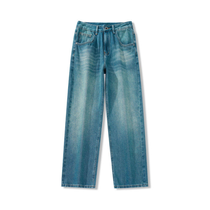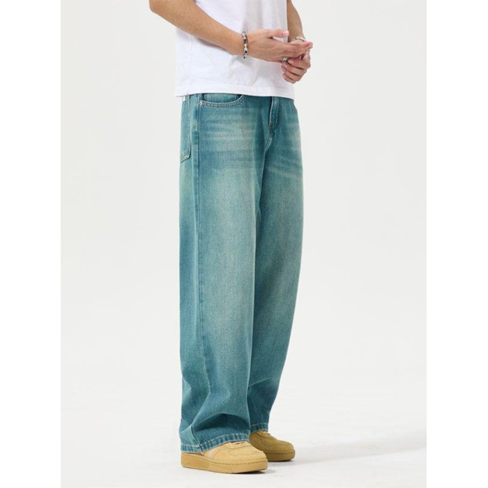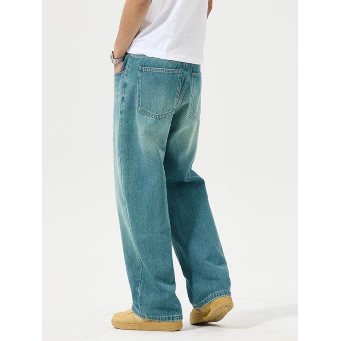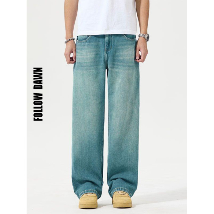 寬松直筒牛仔褲男2025春夏季新款美式潮牌孔雀藍彈力休閒濶腿褲子