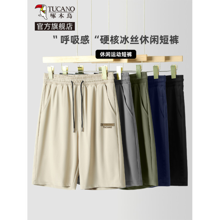 啄木鳥薄款短褲男夏季冰絲跑步運動五分褲痞帥外穿沙灘休閒男褲Y
