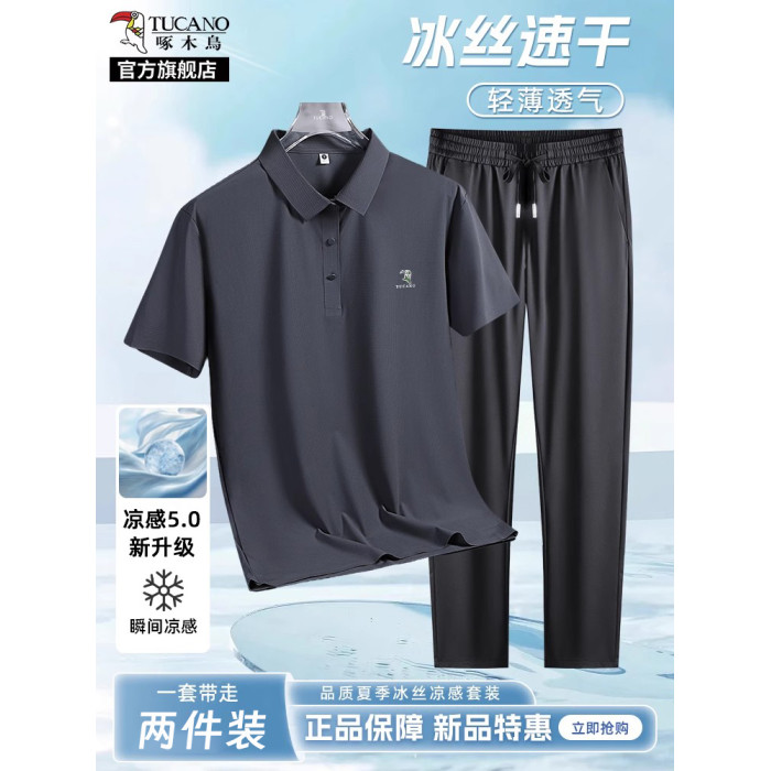 啄木鳥官方旗艦男裝爸爸冰絲短袖男士夏季套裝t恤2024新款polo衫K