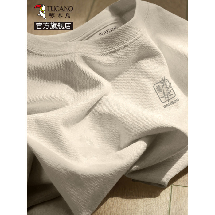 啄木鳥國潮竹子短袖t恤男夏季男士重磅寬松純棉卡其色圓領體恤YB