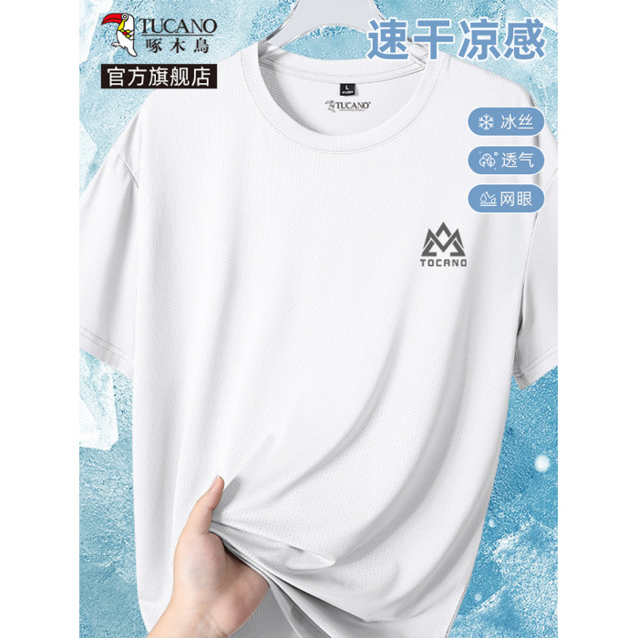 啄木鳥冰絲速乾t恤男短袖夏季薄款涼感休閒半袖男士跑步運動上衣Y