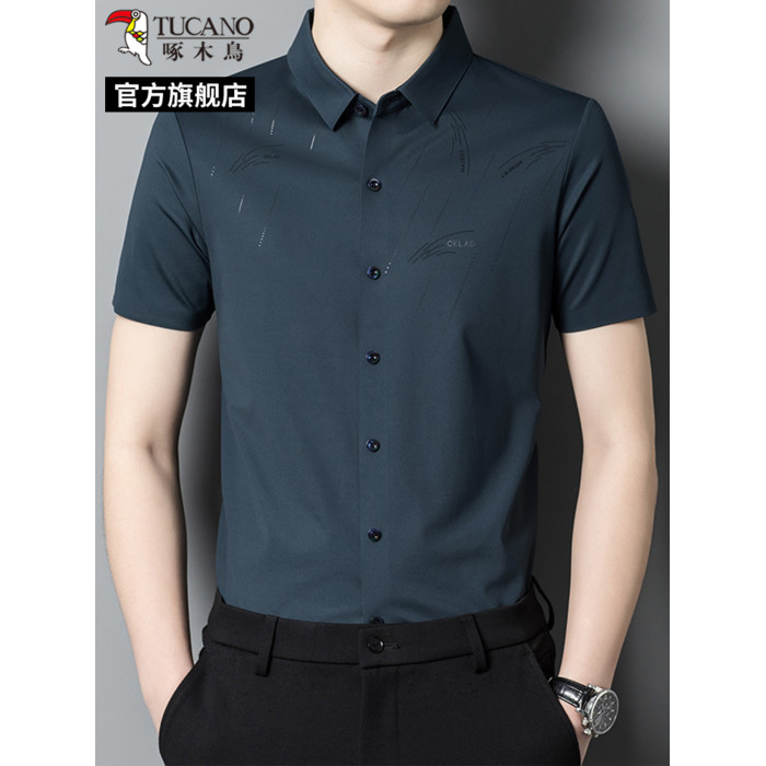 啄木鳥翻領印花襯衫男士短袖夏季薄款中年爸爸無痕冰絲襯衣男裝C