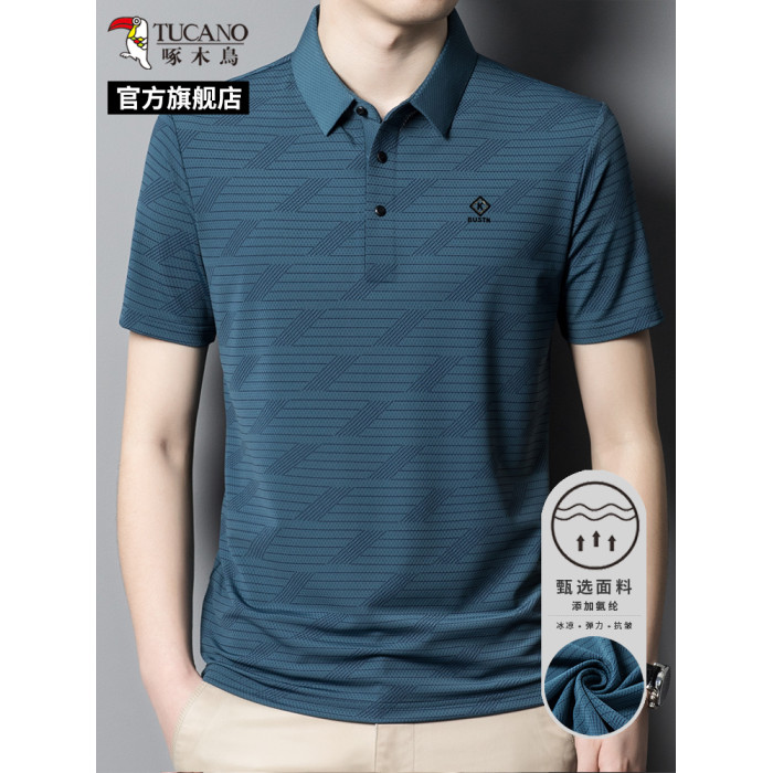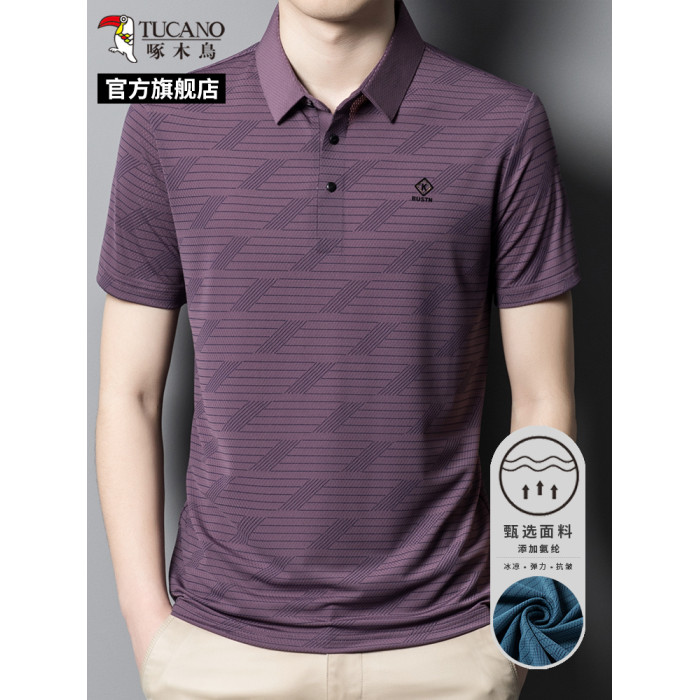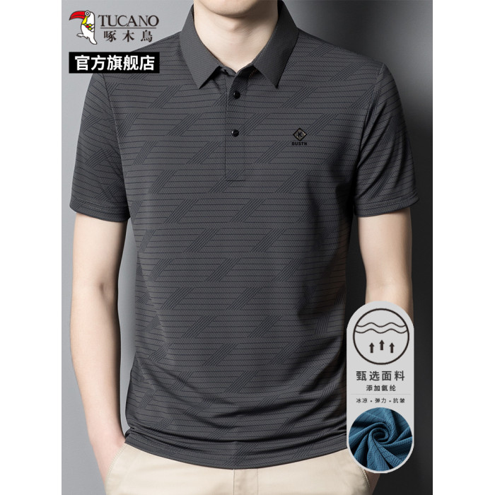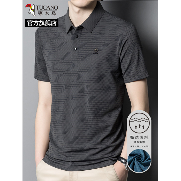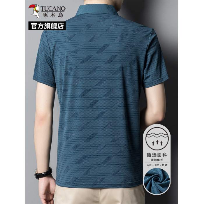 啄木鳥冰絲短袖T恤夏季新款條紋POLO衫中年男士商務休閒半袖體恤C