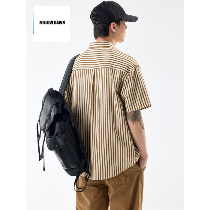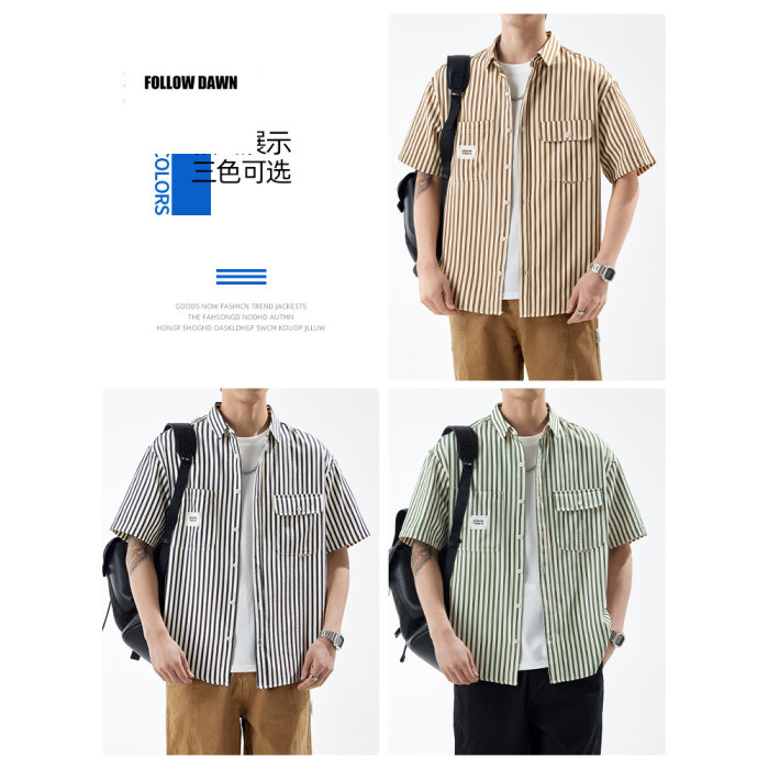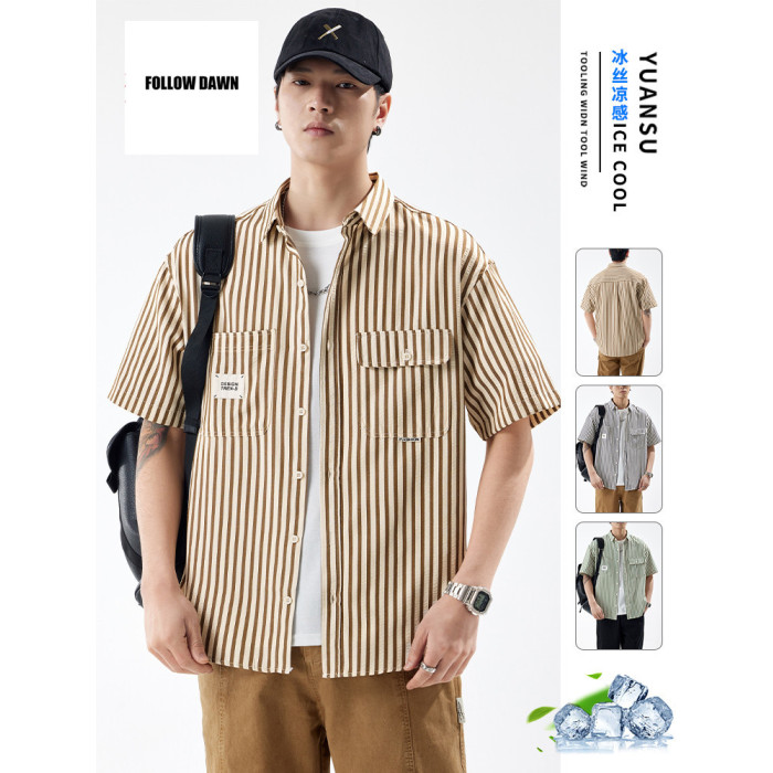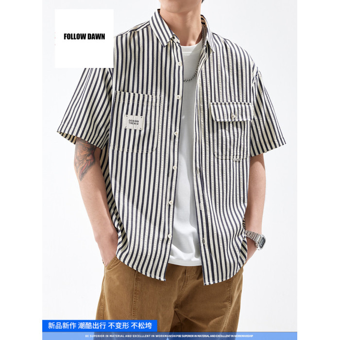 夏季竪條紋泡泡紗短袖男士工裝襯衫日系簡約寬松半袖襯衣