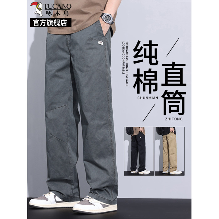 啄木鳥純棉褲子男士休閒褲夏季薄款2025新款寬松直筒運動工裝褲K