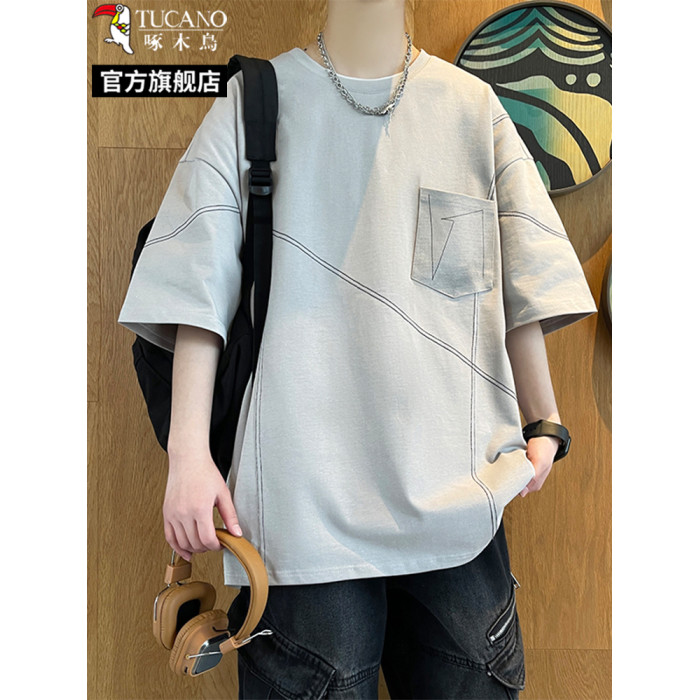 啄木鳥純棉短袖t恤男士2025新款夏季設計感半袖寬松痞帥休閒體恤L