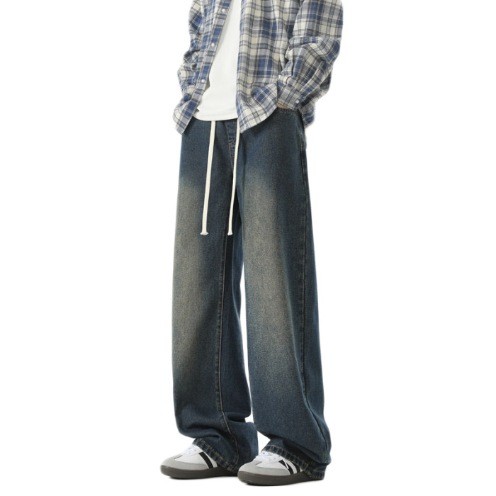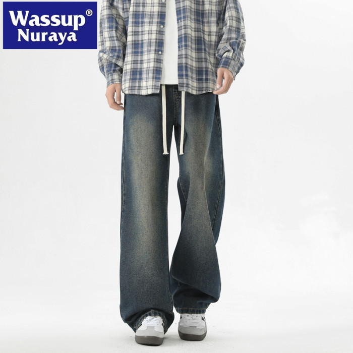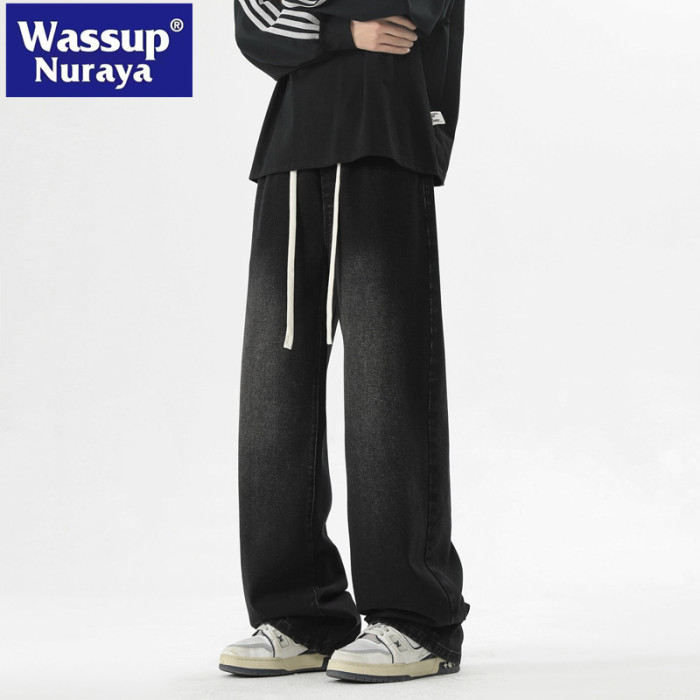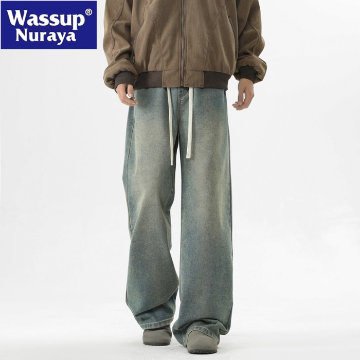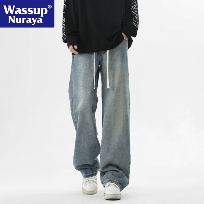 WASSUP NURAYA美式抽繩牛仔褲男春秋寬松休閒濶腿高街直筒長褲男