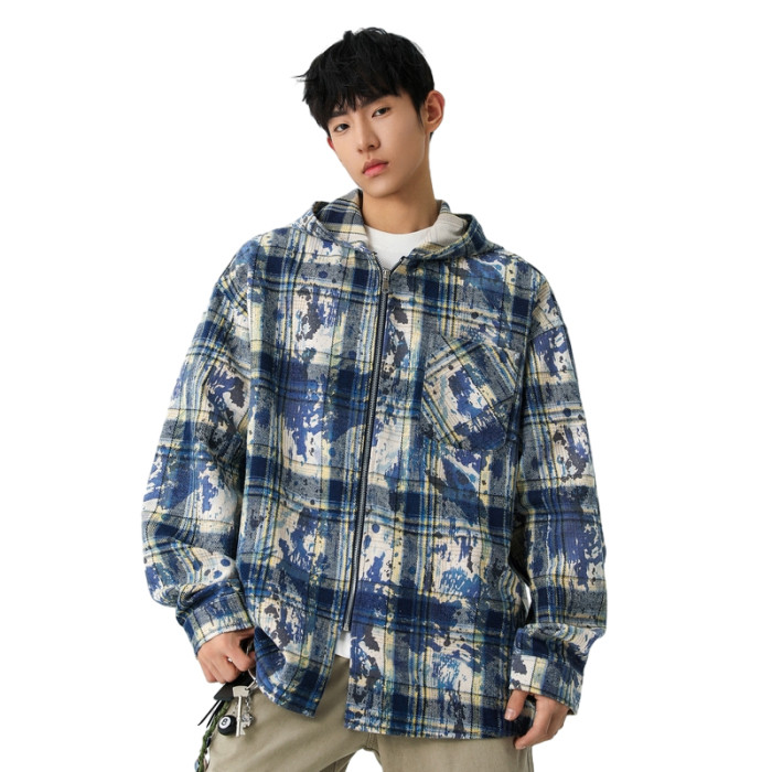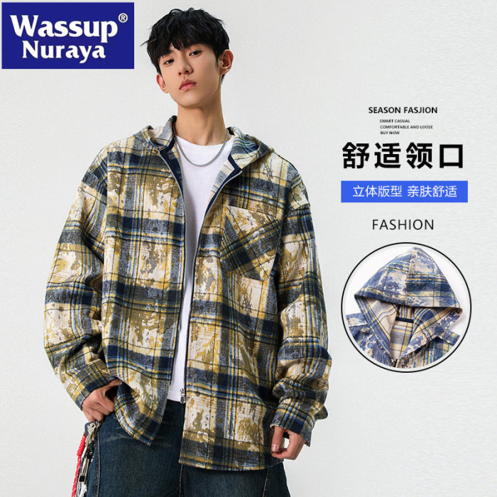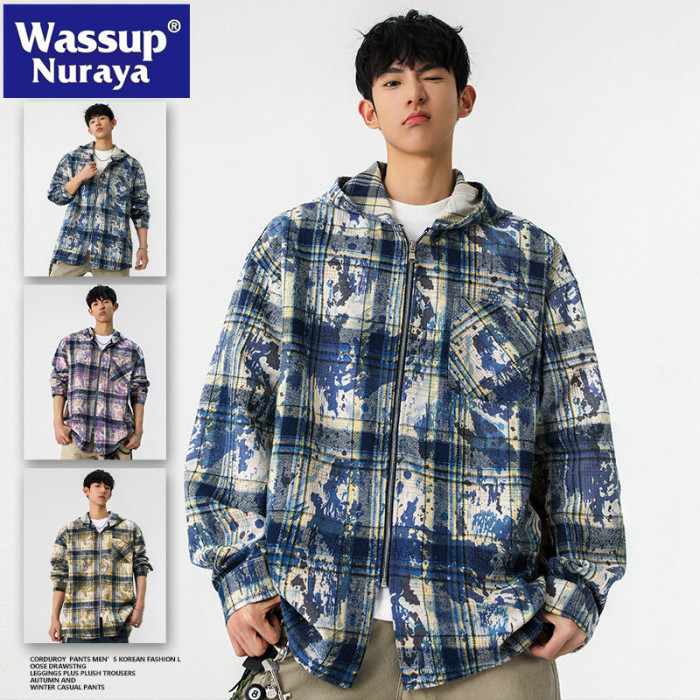 WASSUP NURAYA紥染格子襯衫男長袖春秋格紋襯衣百搭休閒連帽外套