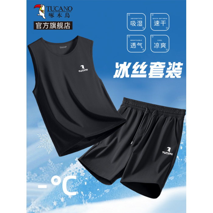 啄木鳥冰絲速乾套裝男夏季寬松大碼跑步透氣運動背心短褲兩件套Y