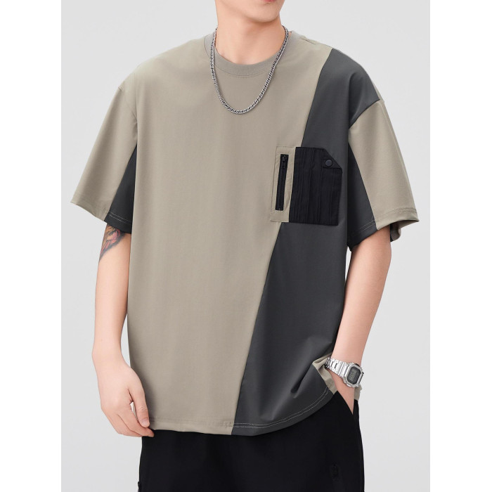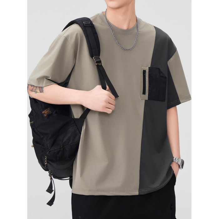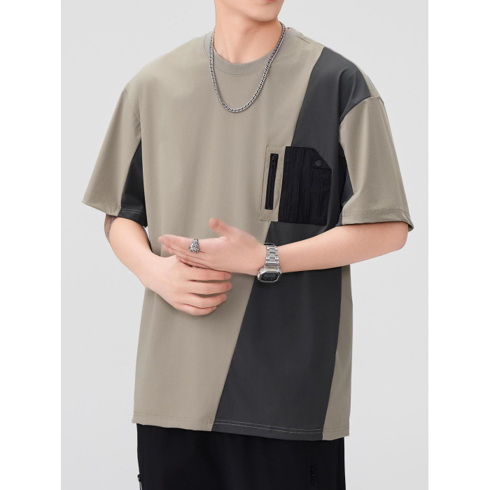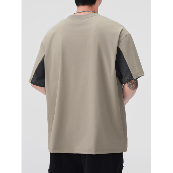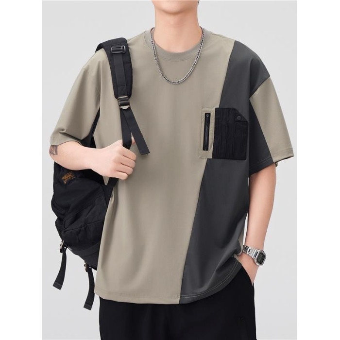 涼感速乾冰絲t恤男2025夏季美式撞色拼接工裝短袖休閒半袖體恤衫