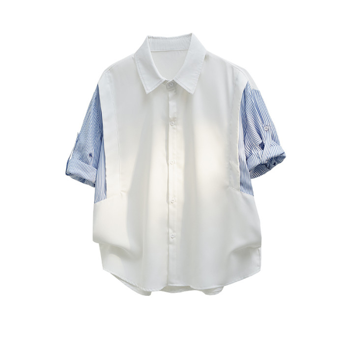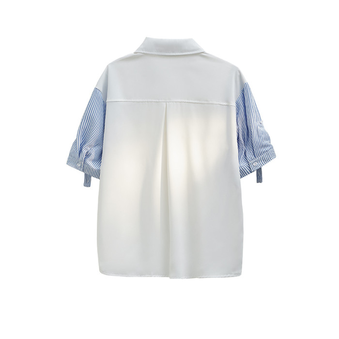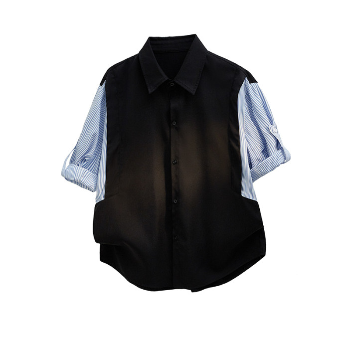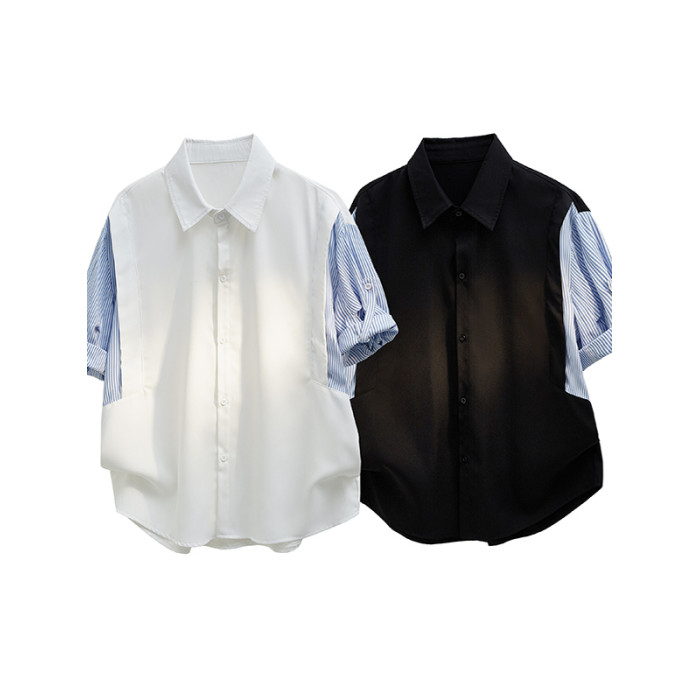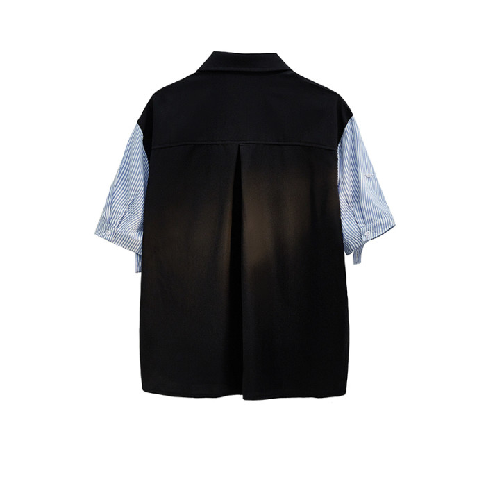 WASSUP NURAYA日系潮牌假兩件條紋拼接短袖襯衫男士寬松百搭襯衣