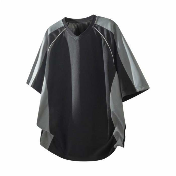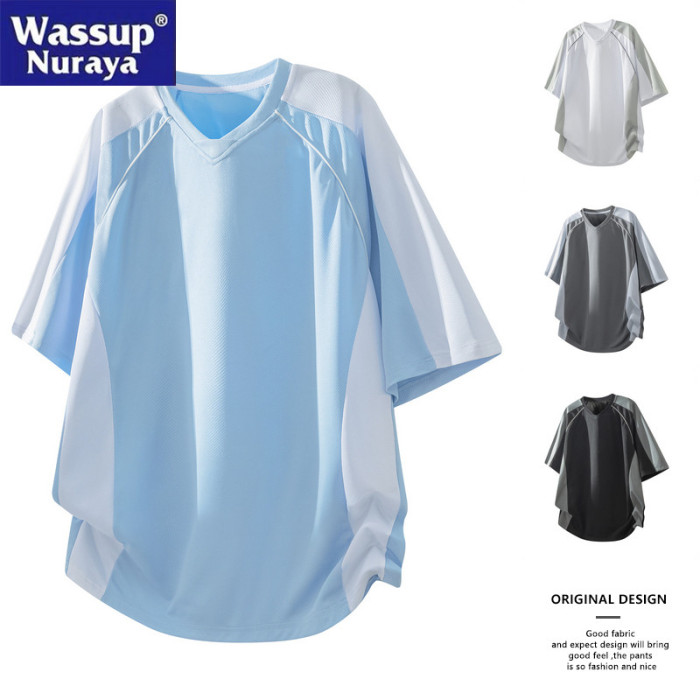 WASSUP Nuraya潮牌短袖t恤男夏撞色拼接寬松運動速乾V領半袖上衣