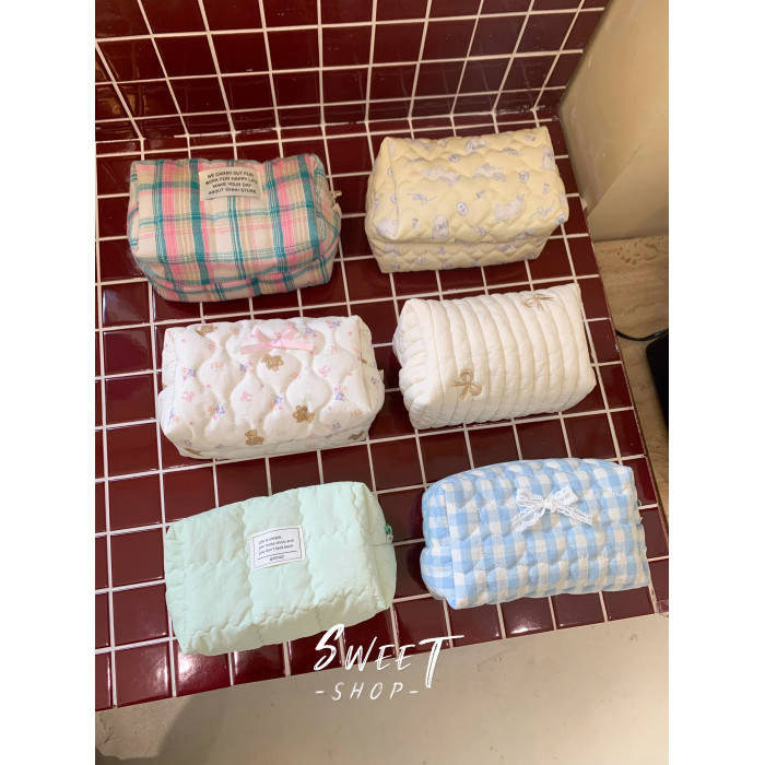 韓國進口絎縫格子ins風化妝包外出旅行收納包桌面整理袋筆袋