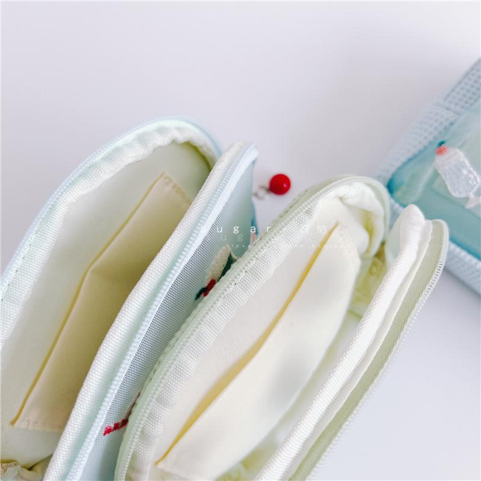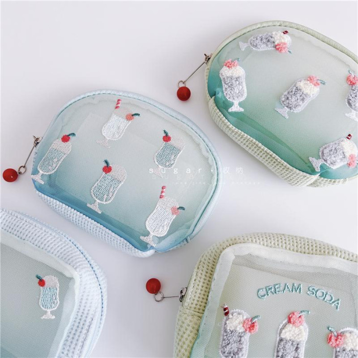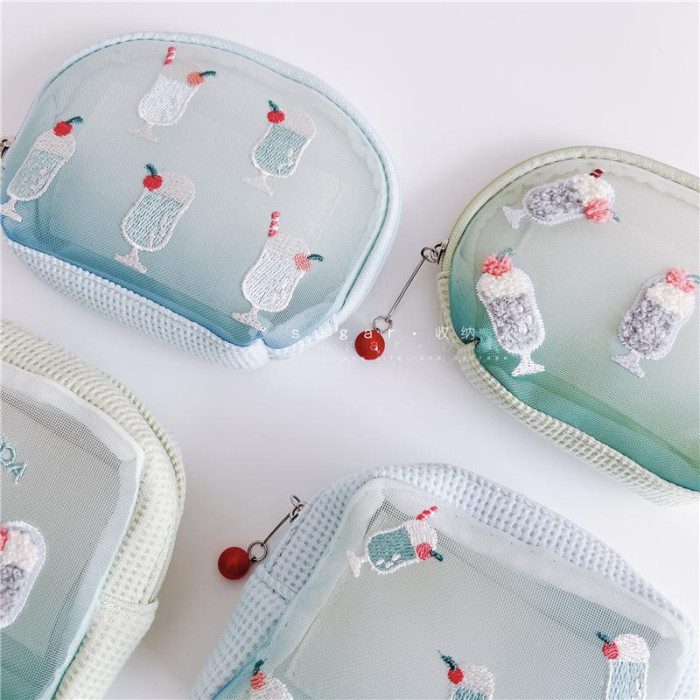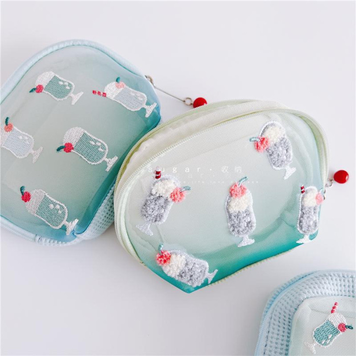 日系卡通可愛冰淇淋刺綉網紗化妝包可攜式隨身小包口紅收納包整理包